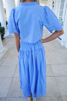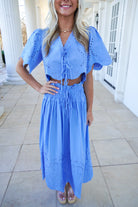 Featuring a perfect light blue, this set is adorable with the drawstring cinched waistband that is so flattering and the flutter sleeves with the ties along the front. We are obsessed!