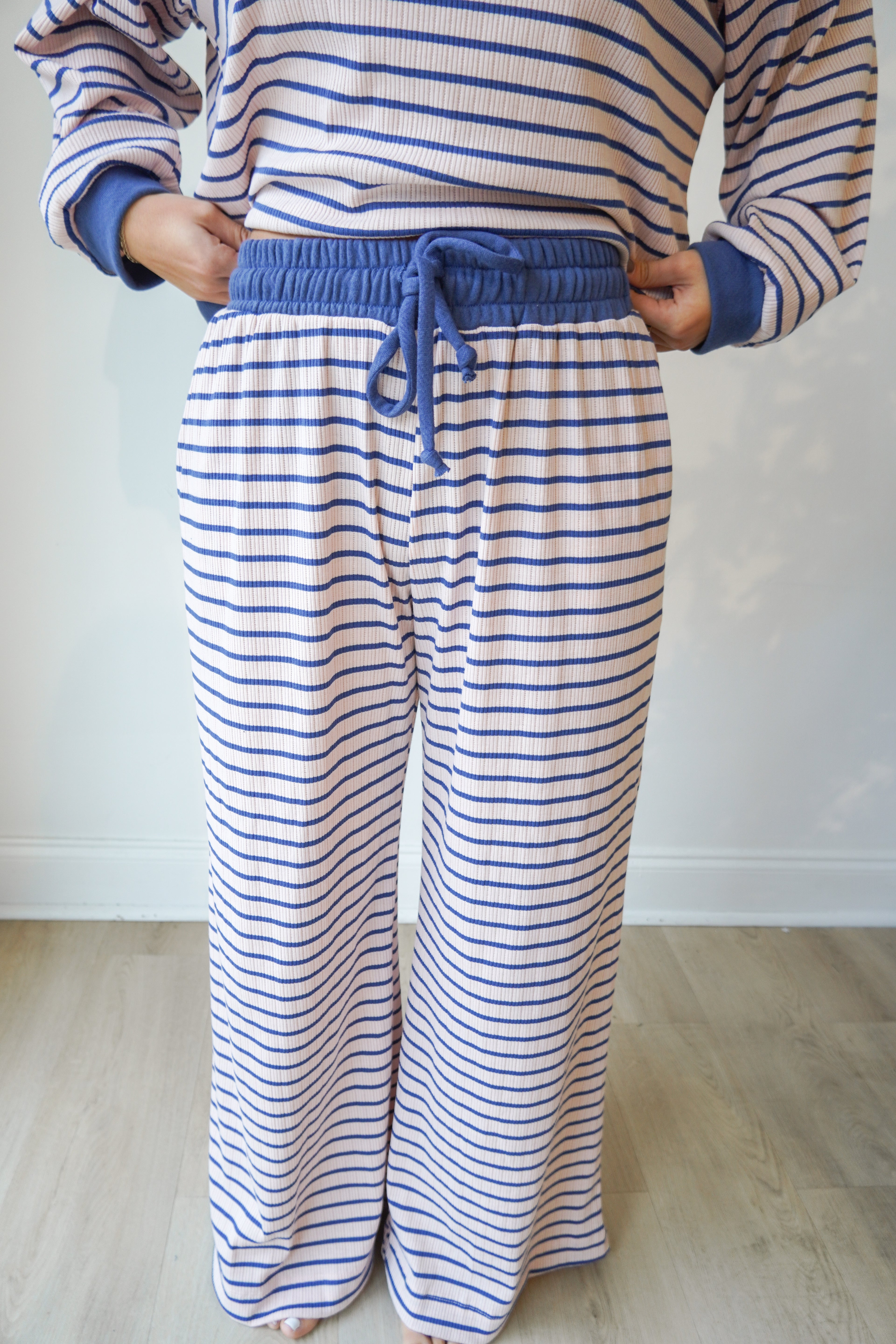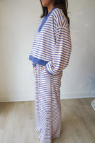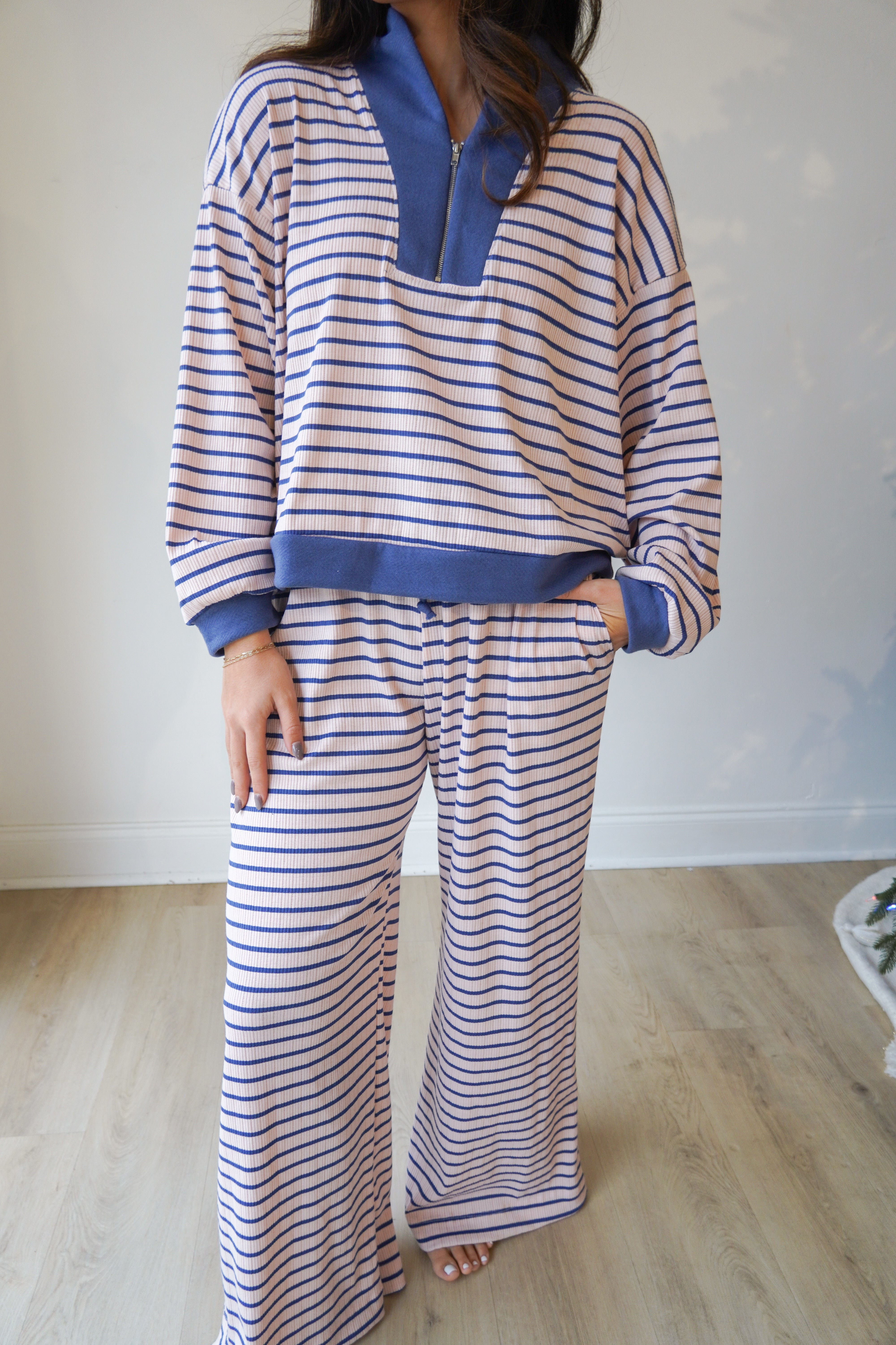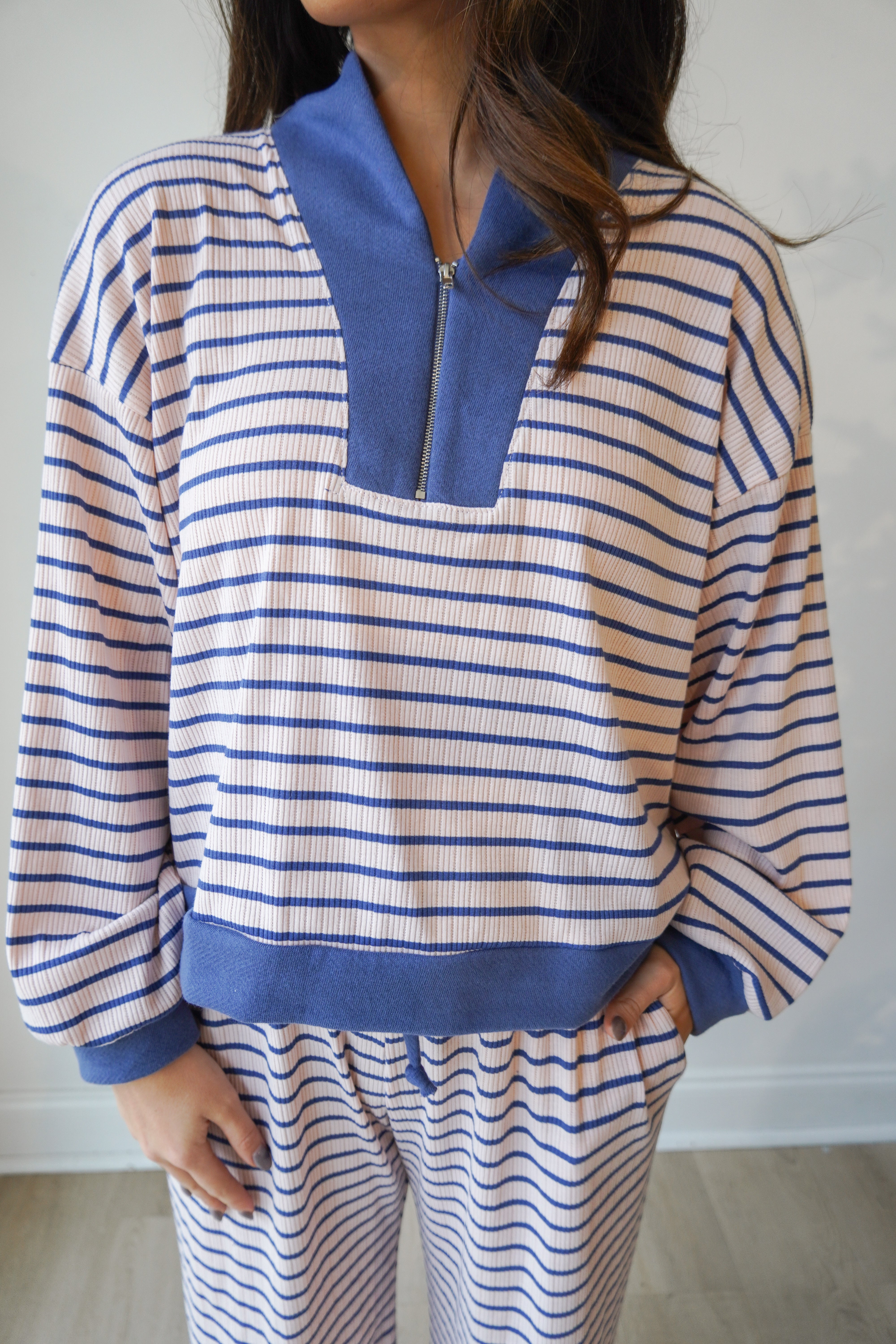 Featuring a blue and pink stripe and a quarter zip crewneck-- this set is so fun and the perfect pop of color! We love the relaxed and flowy fit of the pants with the slight cropped long sleeve.