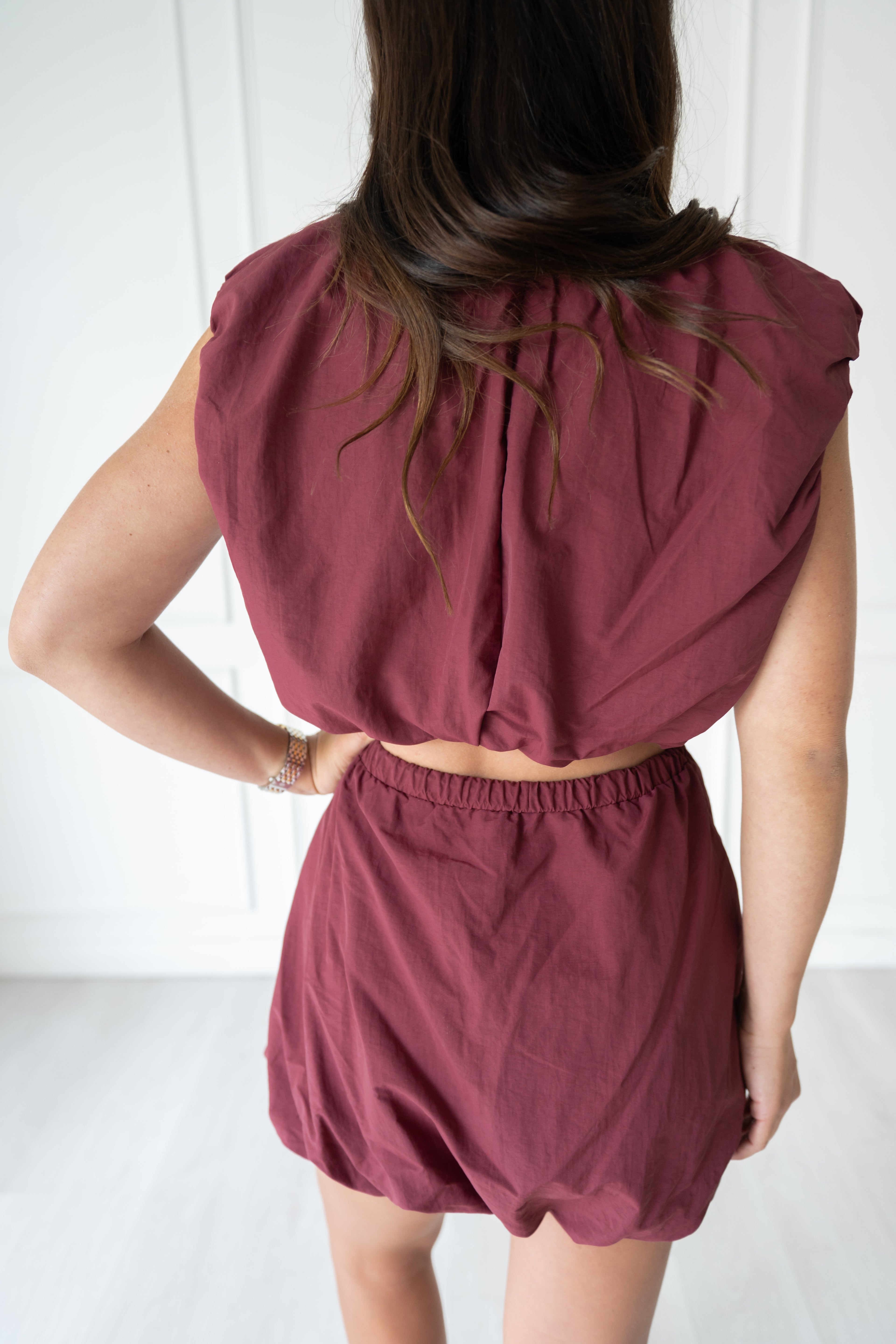 We are obsessing over this bubble set!! Featuring an adjustable cinched waistband on the skirt and capped sleeves on the top-- this windbreaker material is perfect for the hot gamedays!