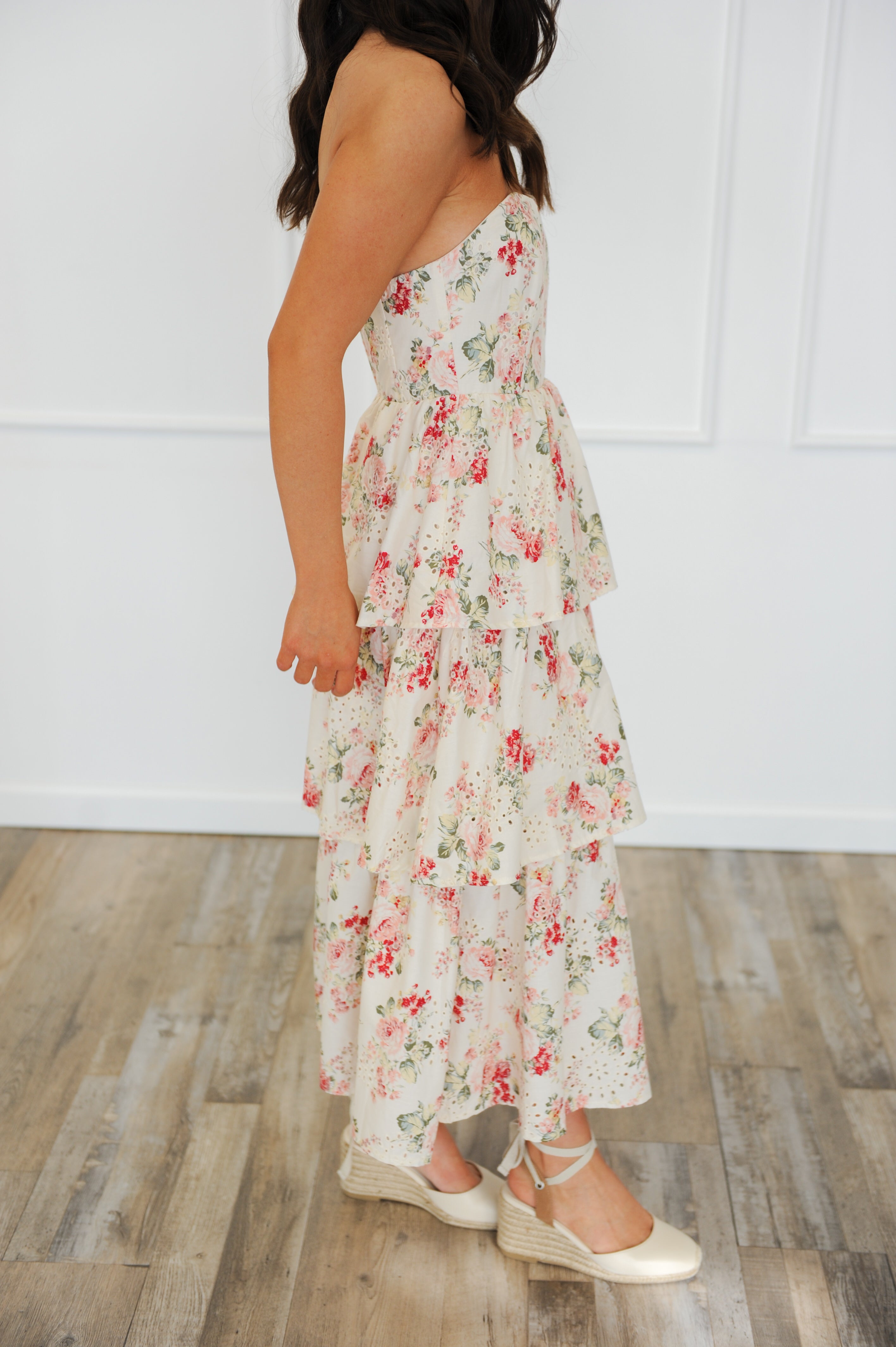 - Be the statement at your next party or wedding in this stunner! The beautiful, floral eyelet fabric and tiered skirt makes this dress feel expensive and designer-like while keeping it budget friendly!