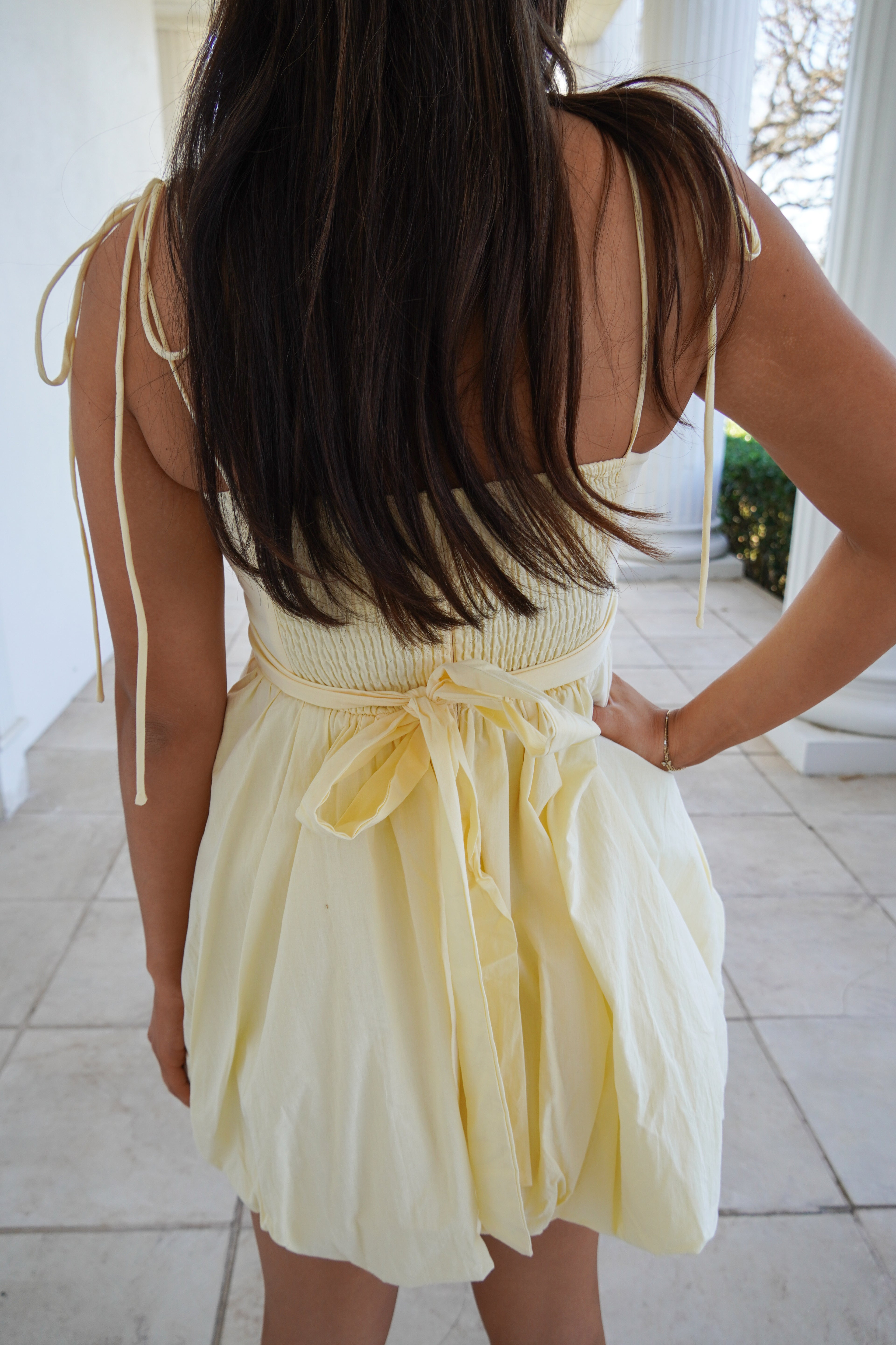 Featuring a straight neckline with a bubble skirt, this pastel yellow mini dress is perfect for a Spring day! Has adjustable tie straps and adjustable bow in the back. Easy to style with sneakers, sandals, or heels-- depending on your occasion!