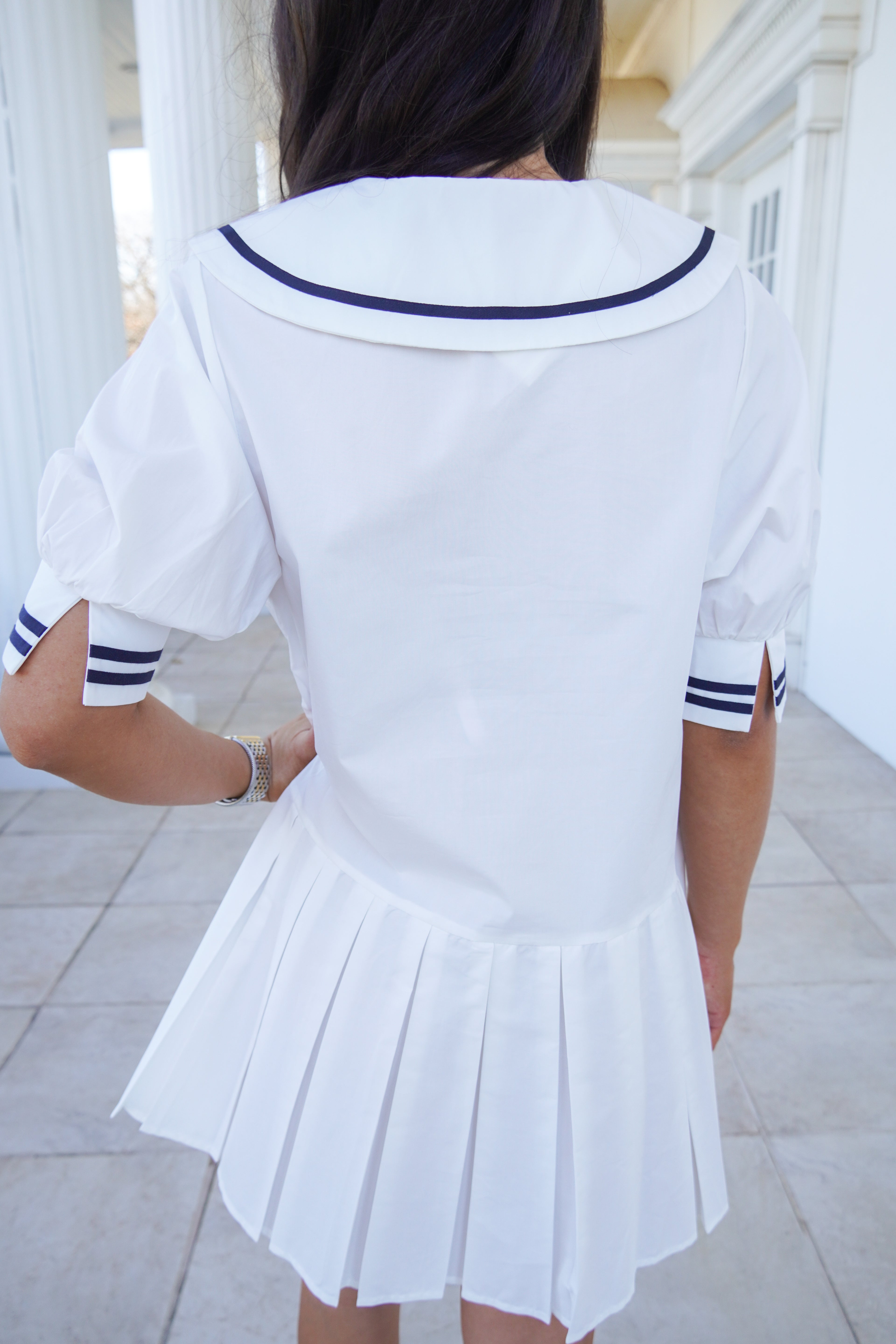 Featuring a fun white and navy mini dress with a peter pan collar, bubble sleeves, and a pleated skirt with fold over pockets!!! We are obsessed with this nautical sailor inspired dress!!