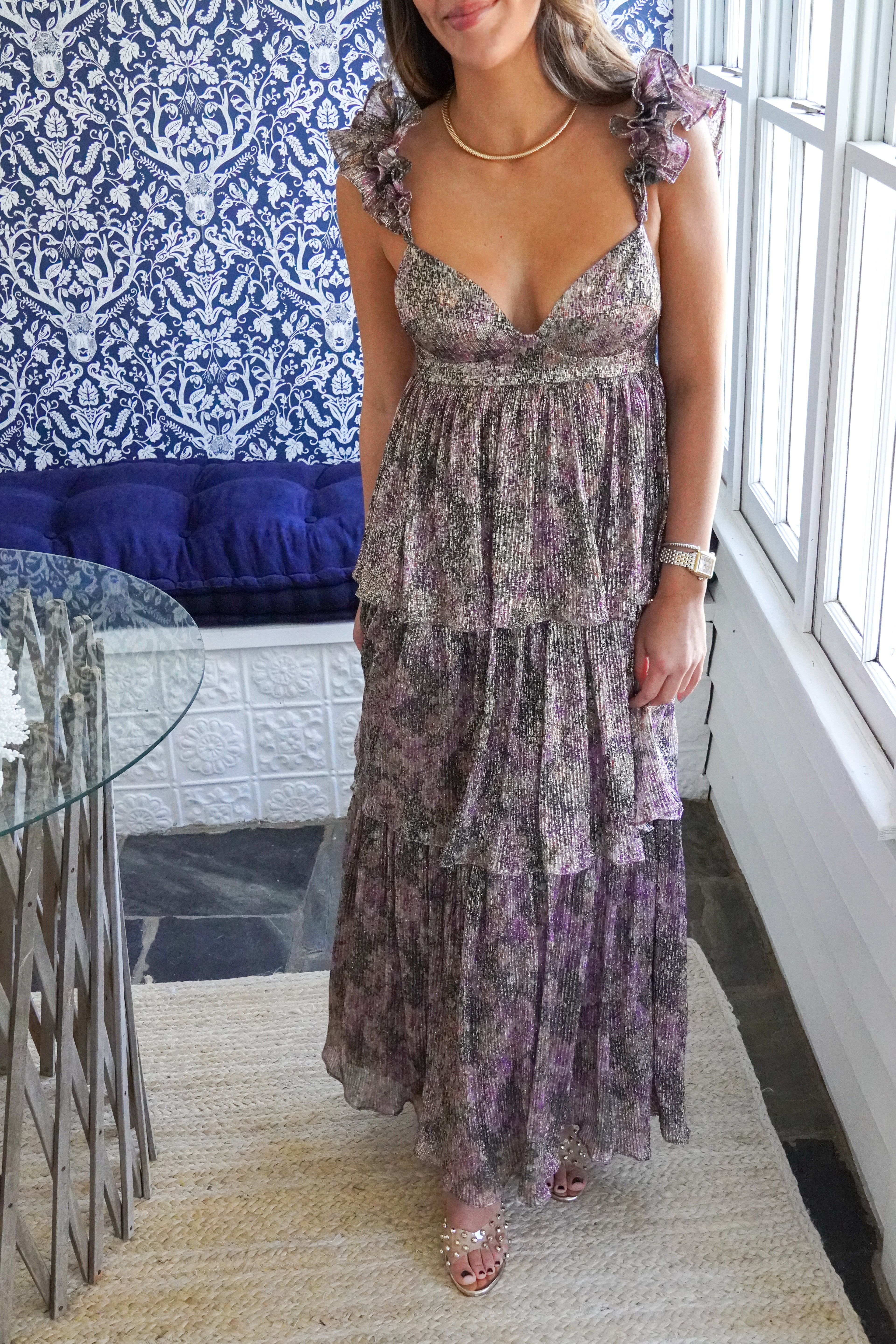 - Featuring a purple, gold, and silver accents, this tiered maxi dress with ruffled sleeves and an open back is perfect as a wedding guest dress or for your next formal!