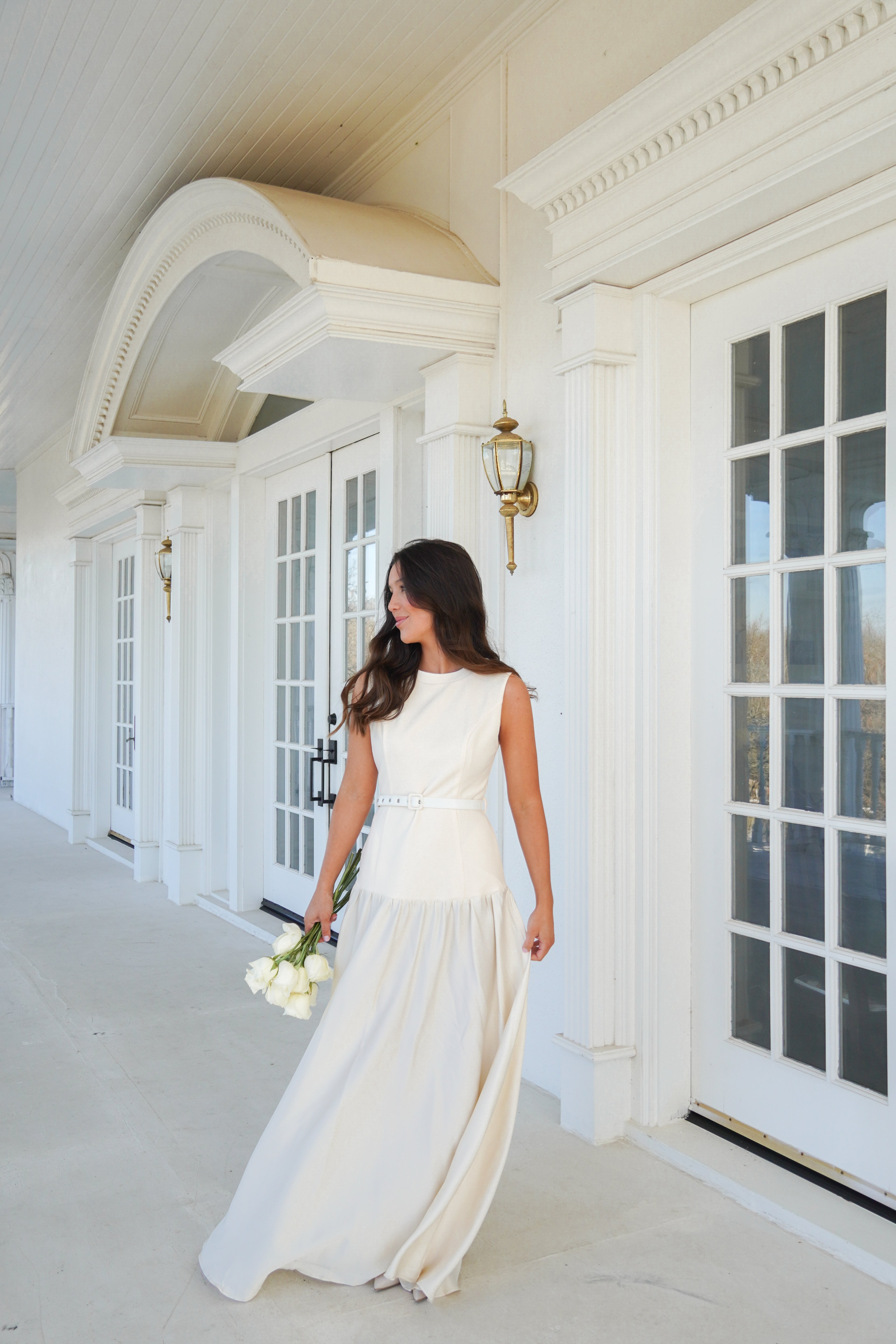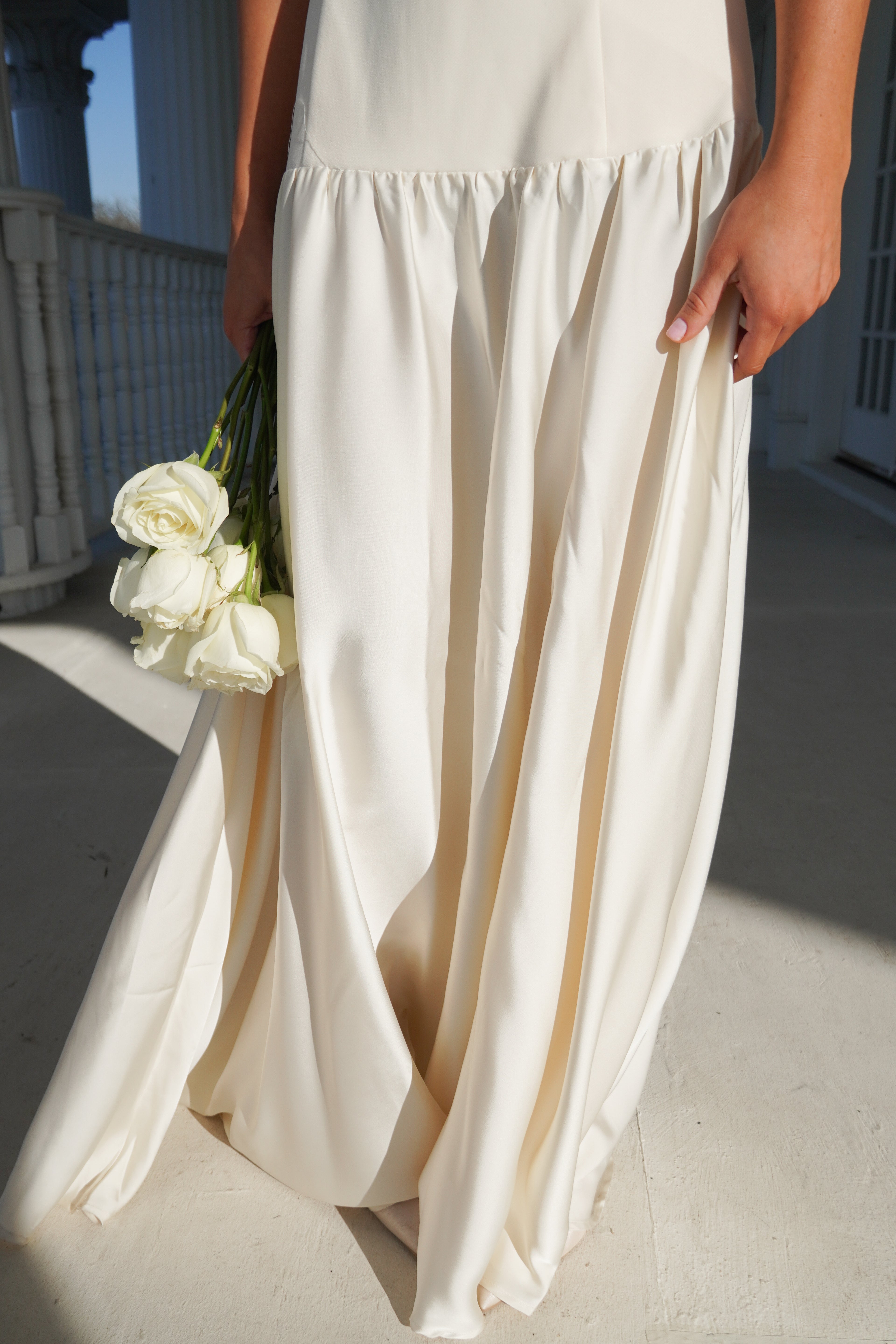 Featuring a drop waist, belt at the waist, and a gorgeous maxi length satin skirt, this dress is gorgeous for your bridal parties and events!