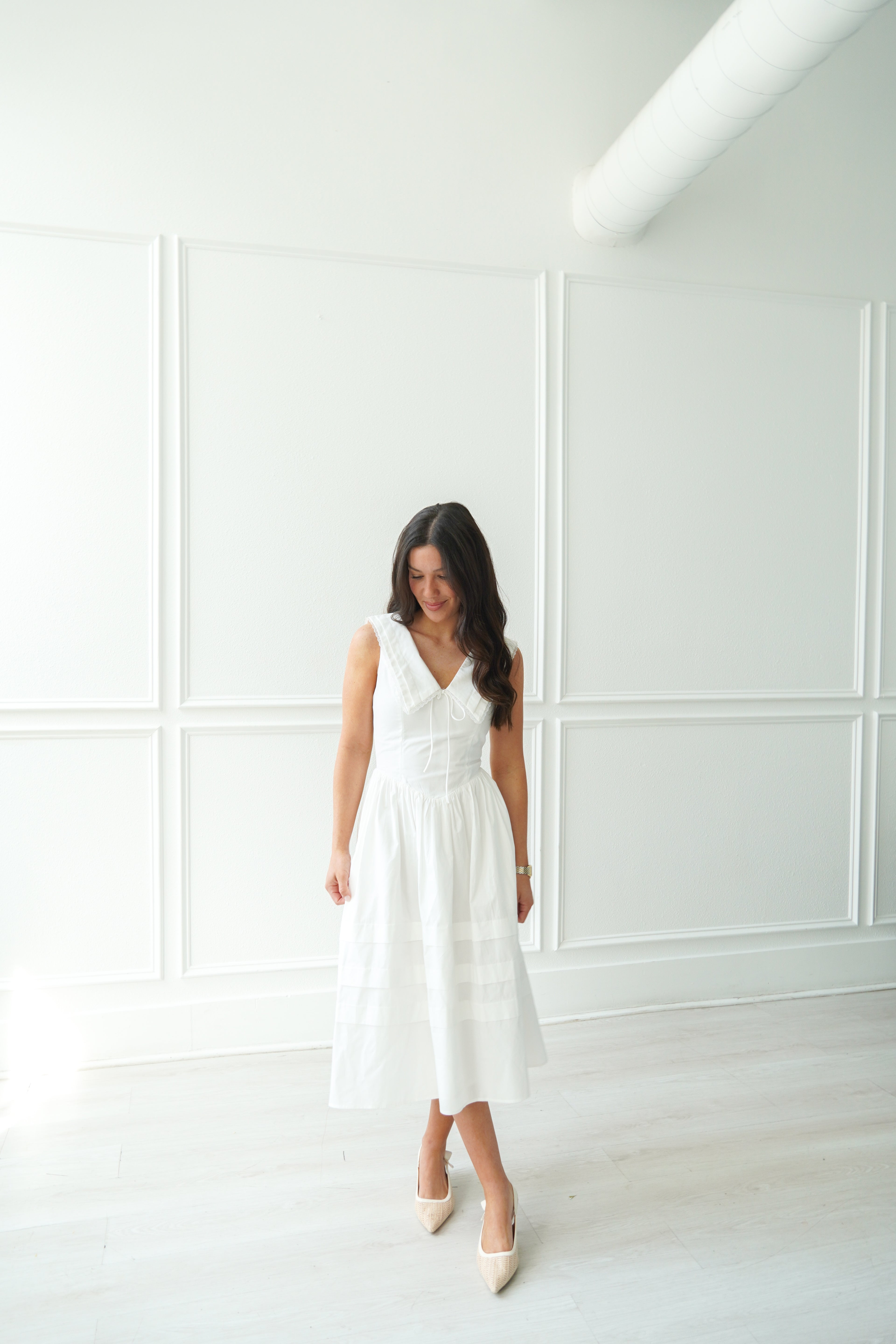 Featuring a beautiful collared v-neck with a drop waist and a midi length skirt, this dress has a perfect cotton blend texture that is perfect for Spring and Summer! It's perfect for graduation, bridal shower, or this Easter!!