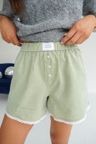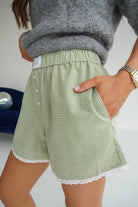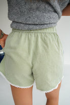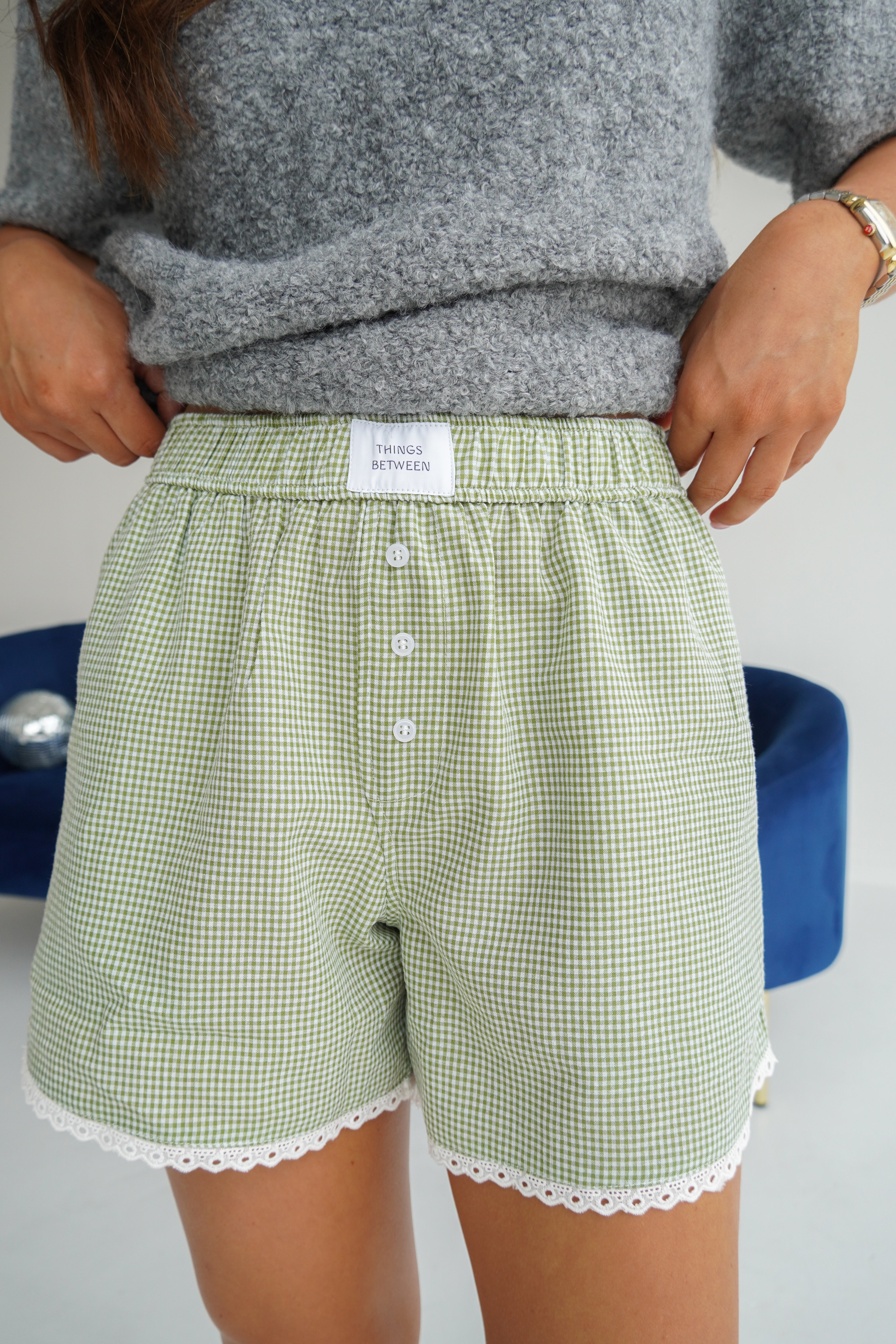 These green and white gingham boxer shorts with an adorable lace trim combine comfort with a playful, classic pattern. The soft, lightweight fabric ensures all-day comfort, while the fun gingham check adds a fresh, stylish touch. With a relaxed fit and an elastic waistband, these boxer shorts can be styled down or up-- depending on where you are headed!