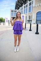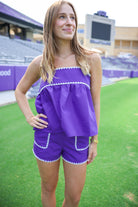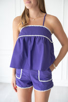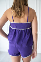 White ric rac trim is the perfect touch to this purple set! The breezy top is ideal for warmer weather to to keep you cool and comfortable.