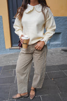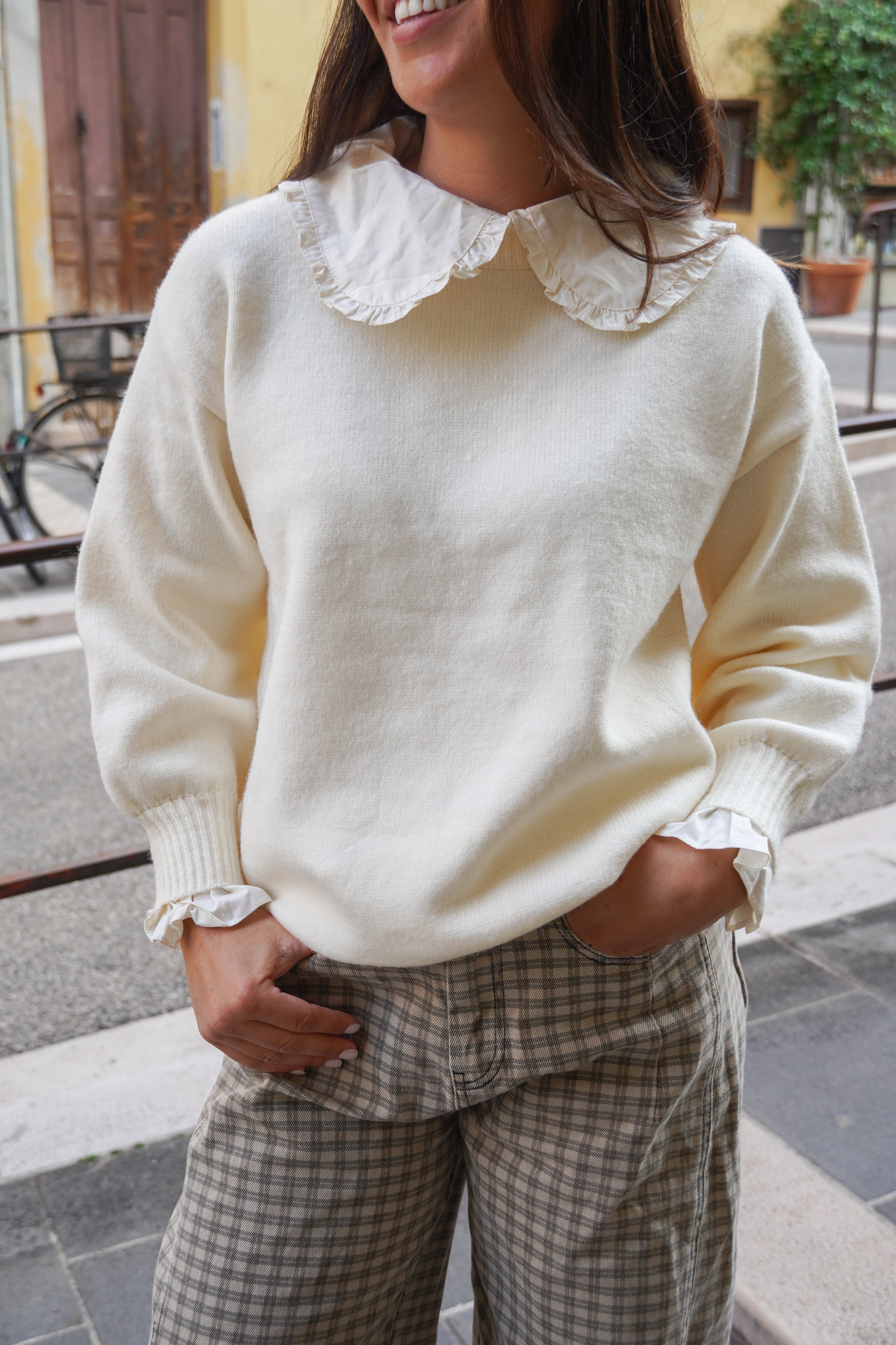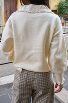 Featuring a soft and comfy fabric, a true ivory color with a peter pan collar & ruffled trimmed sleeves– this sweater is so sweet! This top pairs so well with any skirt or your favorite jeans.