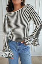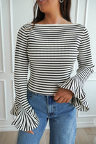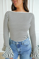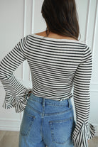 Featuring a black and white stripe, a wide neckline and a stretchy knit fabric-- we are obsessed with the fun bell sleeves and fitted look. Elevate this top with a skirt or jeans for a night out!