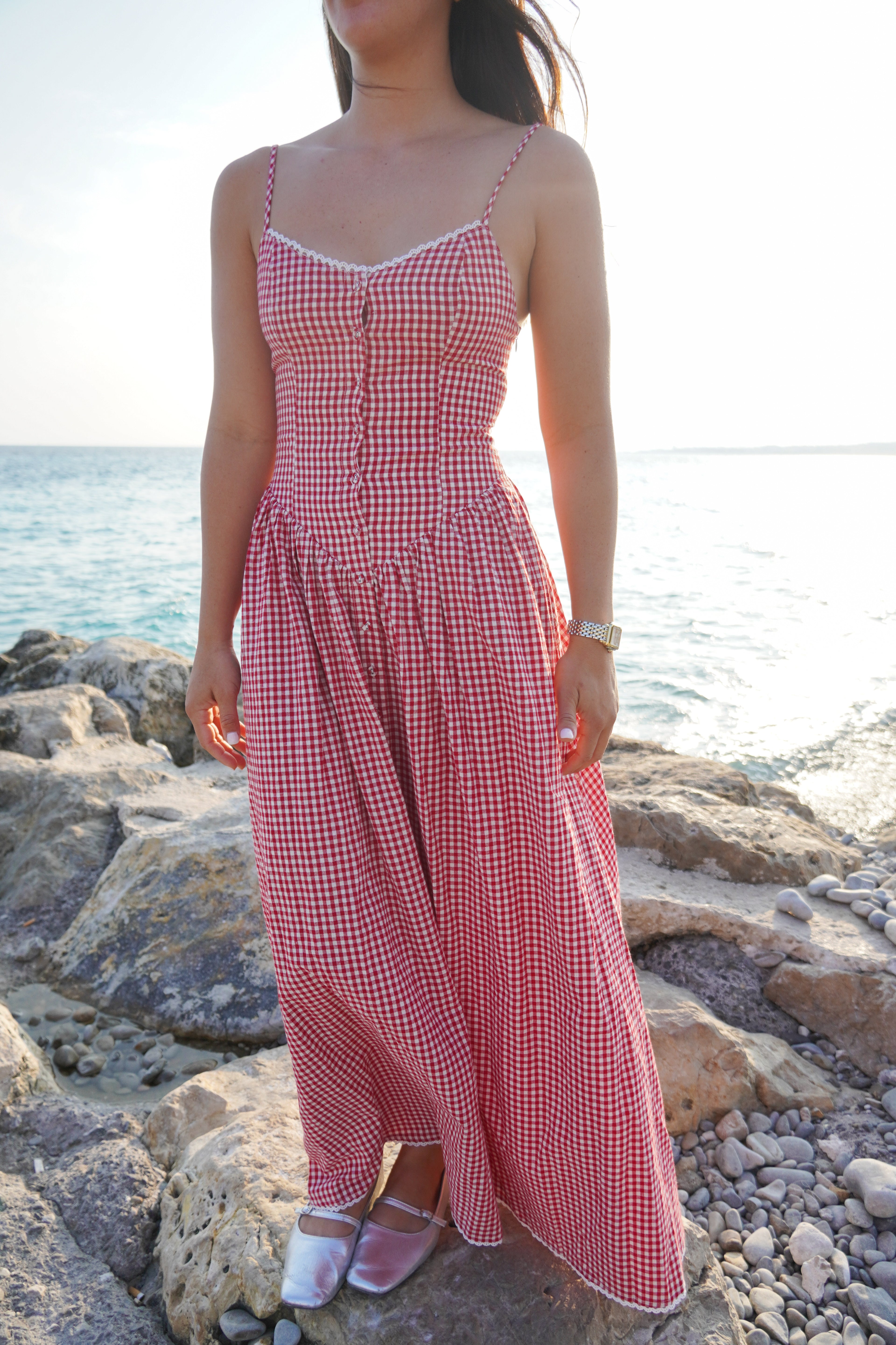 We love how sweet this red gingham maxi dress is! Featuring a sweet lace neckline, buttons trailing down the front, a basque waistline, and adjustable straps– this dress is so fun & so feminine!!!!