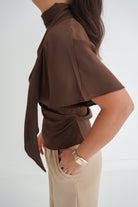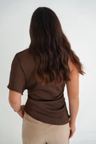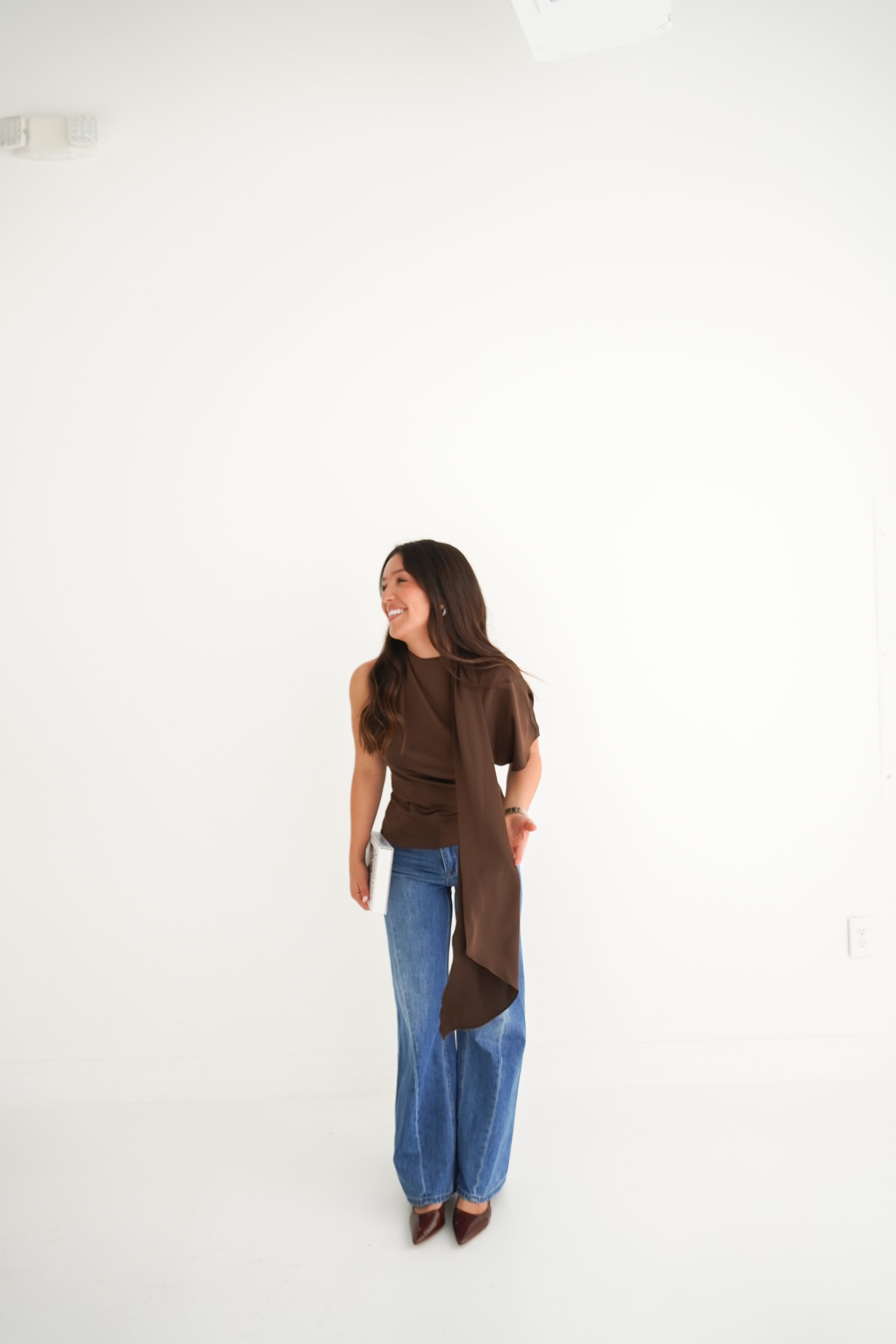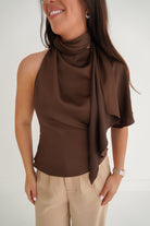 Featuring a satin chocolate brown, a one shoulder asymmetrical draped neckline with an attached scarf-- this top is chic, effortless and perfect to style with jeans, a mini skirt or trousers-- depending on your occasion.