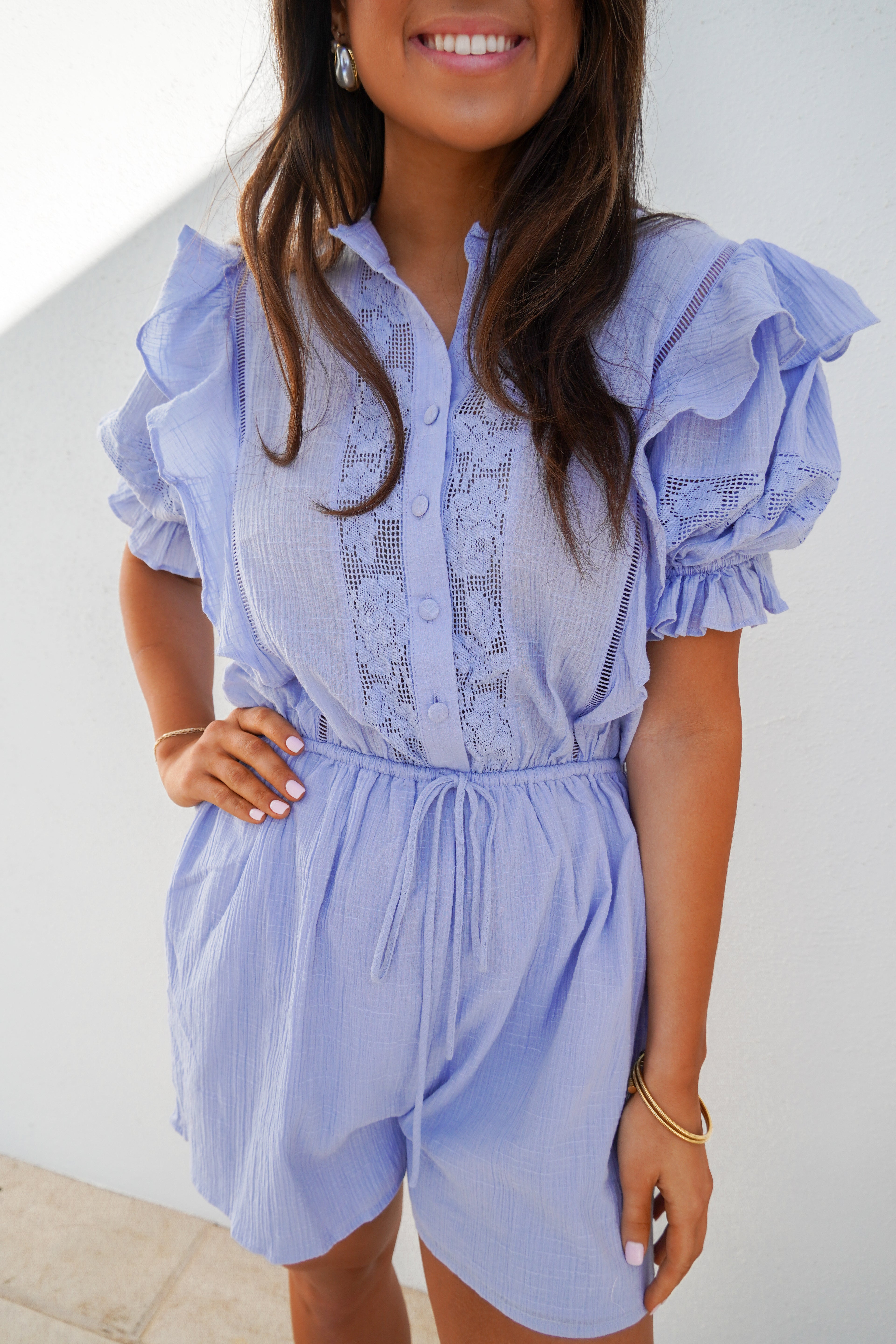 Featuring a lightweight fabric in blue, we love the soft lace detailing with fluttery ruffle puff- like sleeves. With a button up front and adjustable drawstring waist. We love how dreamy this romper is!!!