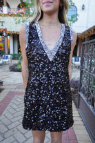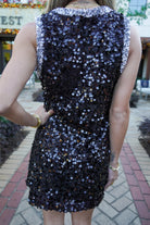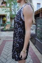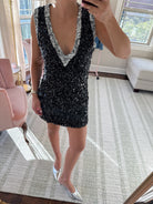 Featuring black and silver sequins throughout-- this dress is bringing the fun to your party!!! We love the flattering fit and deep v-neck.