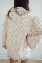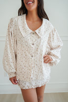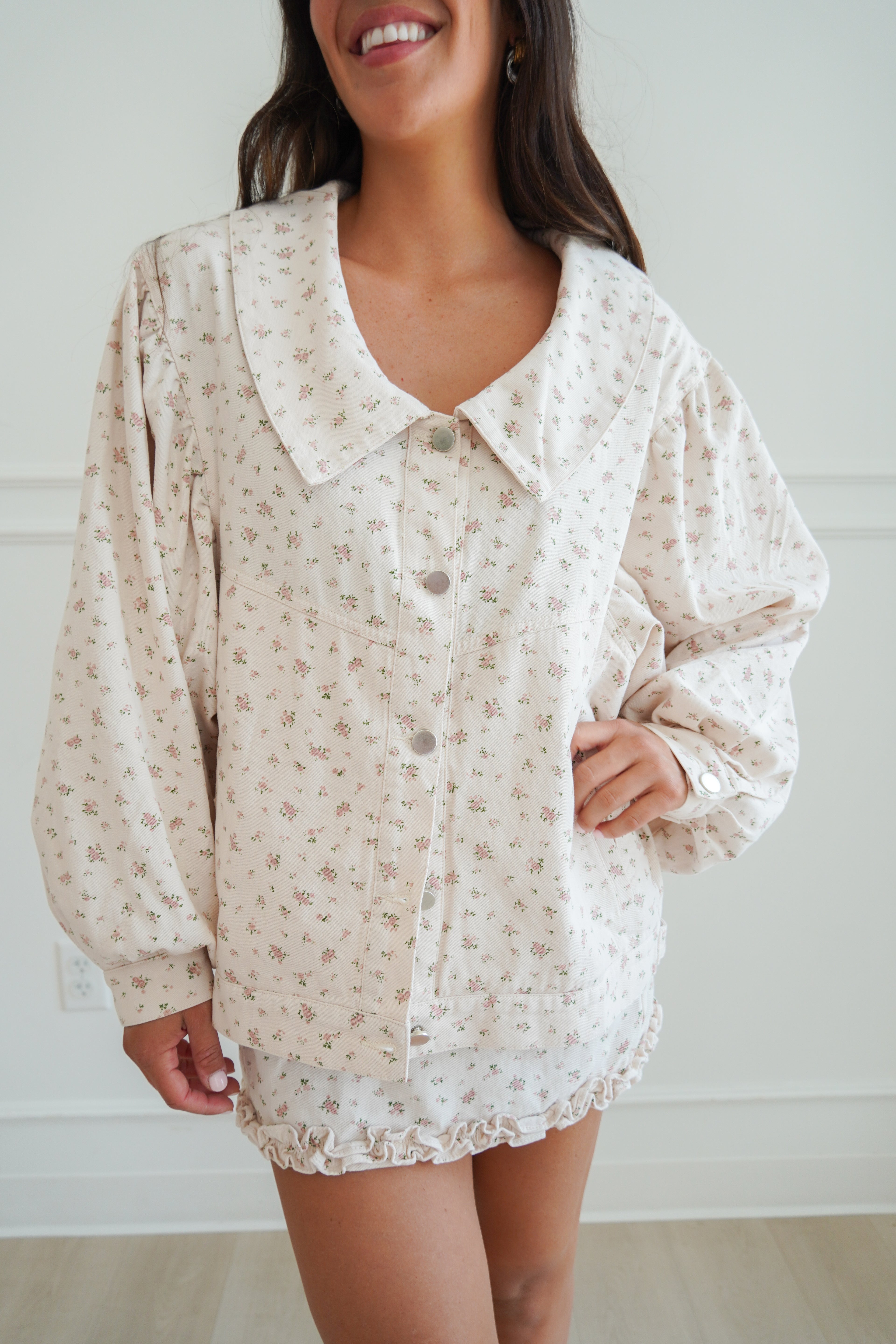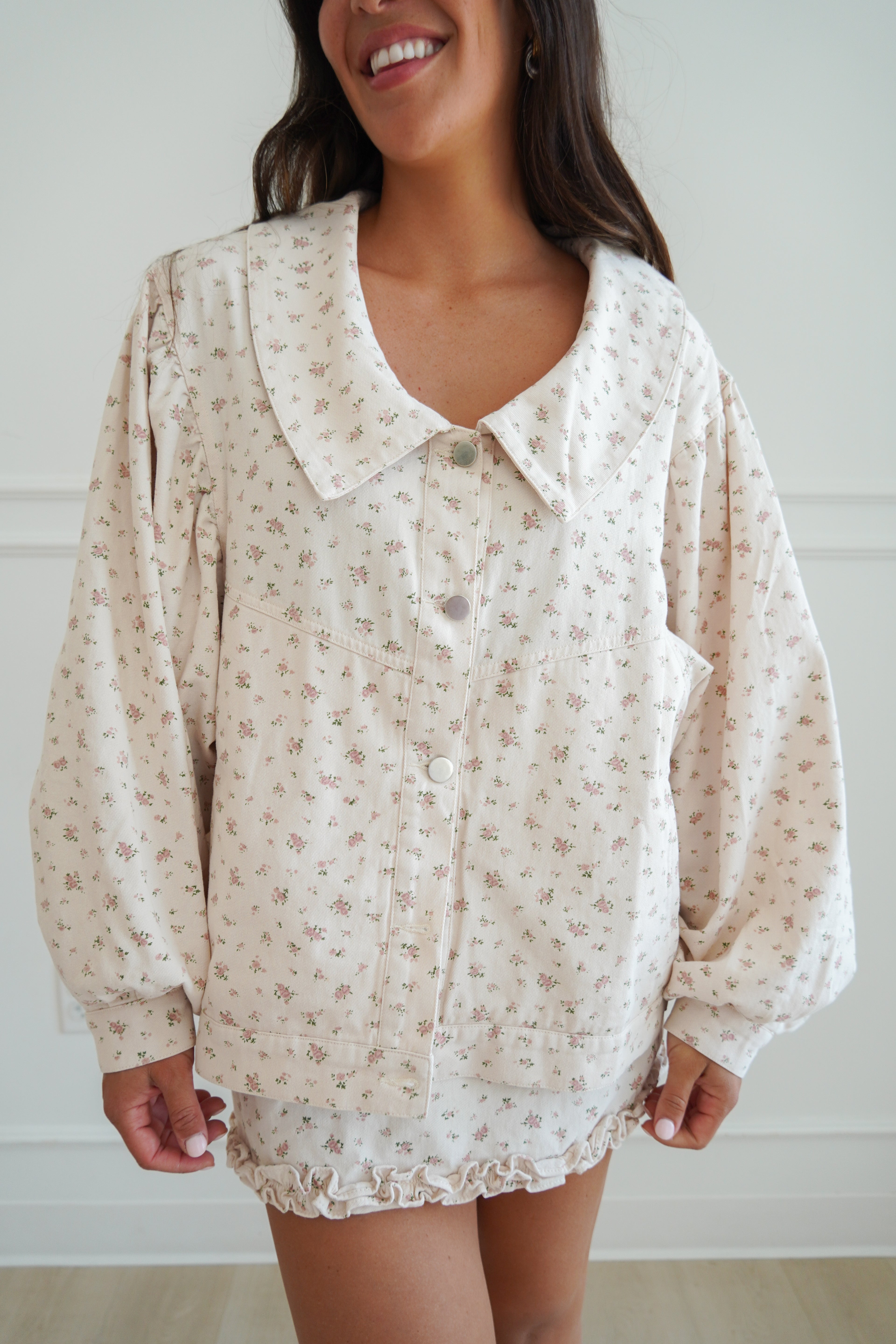We can't get over how darling this denim set is!! Featuring a ditsy floral pattern, a relaxed collar, balloon sleeves, an oversized jacket & a ruffle hem on the skirt– there are just so many cute details to obsess over. Perfect for a country concert paired with boots or fun outing with friends paired with kitten heels!