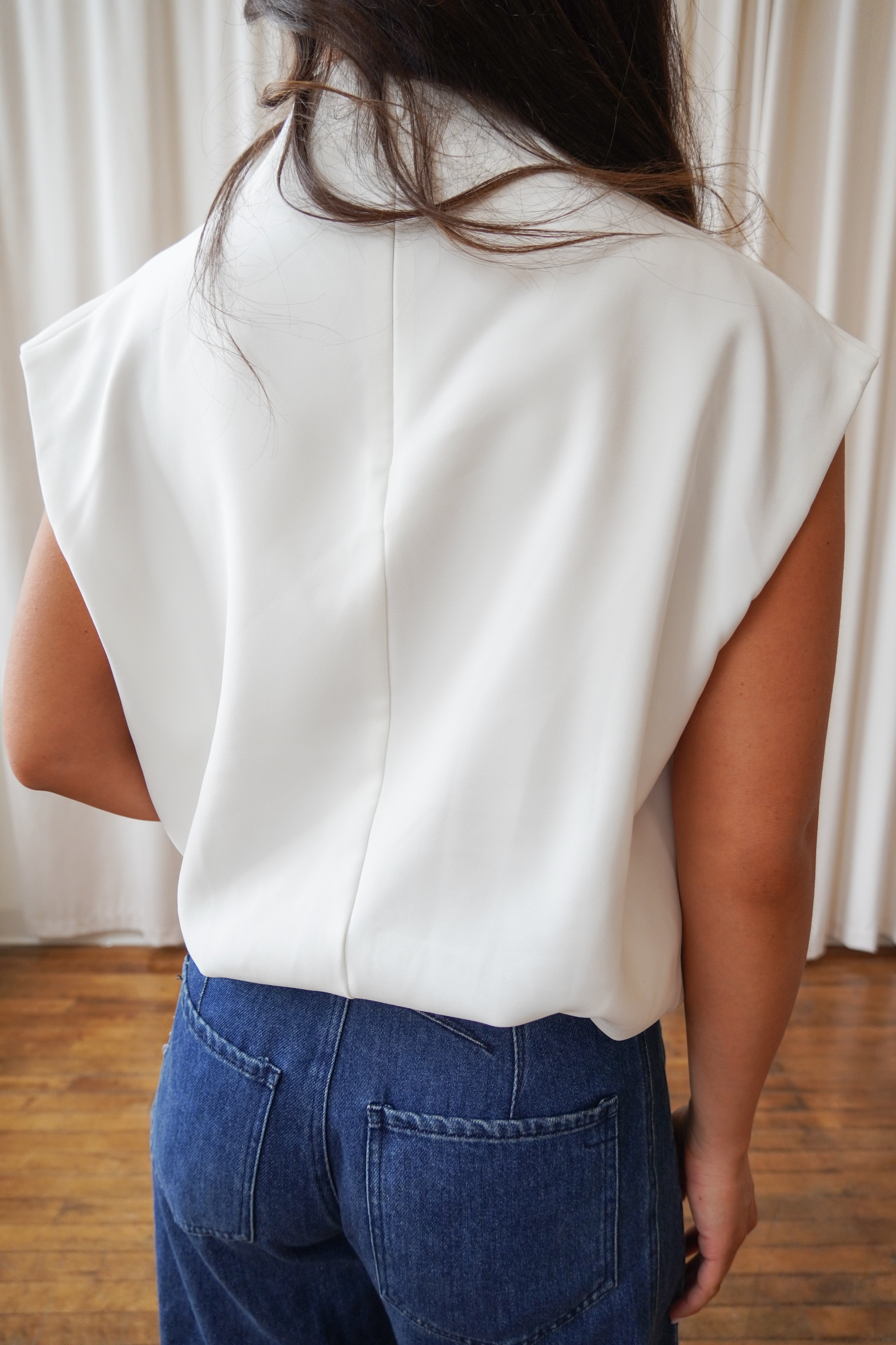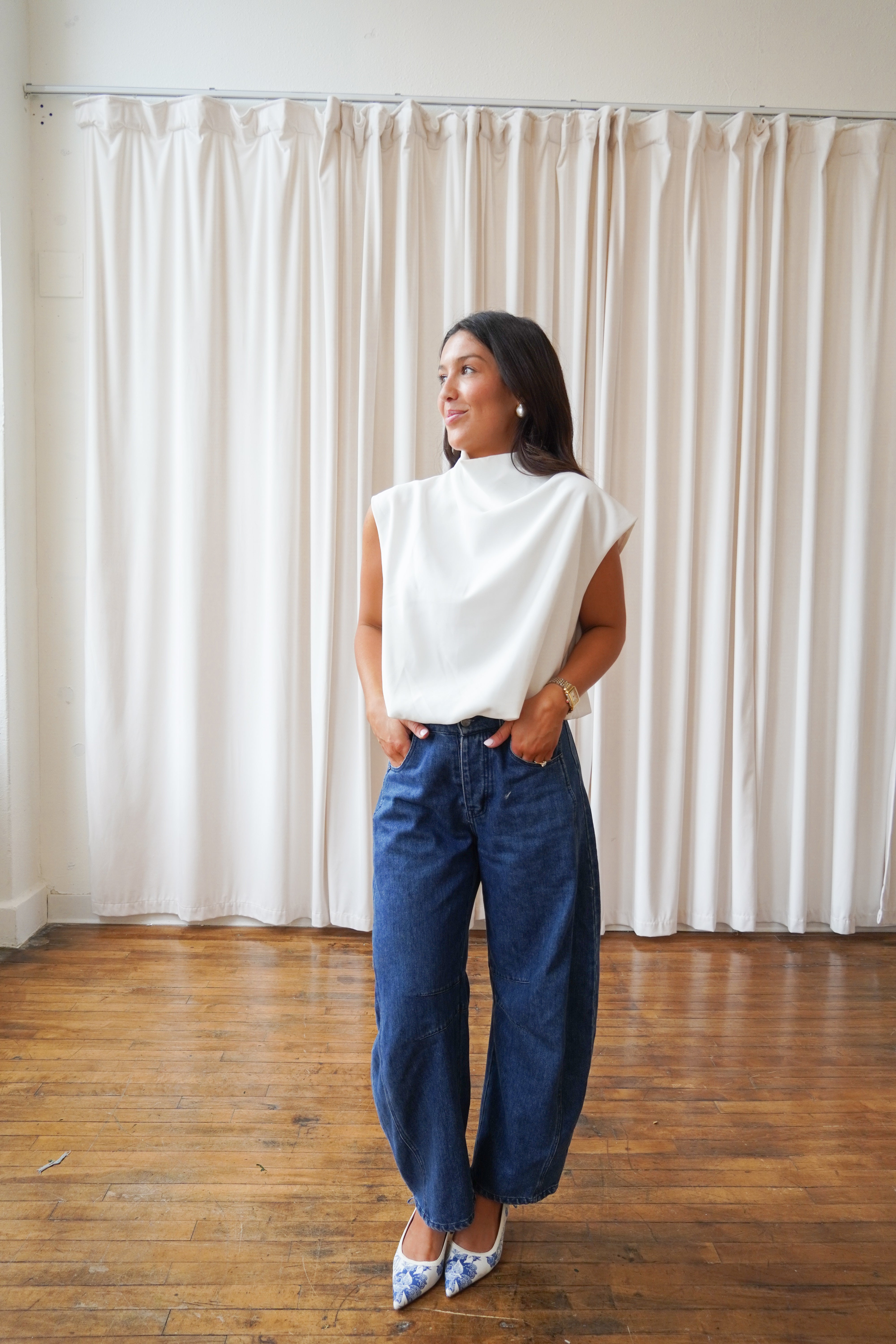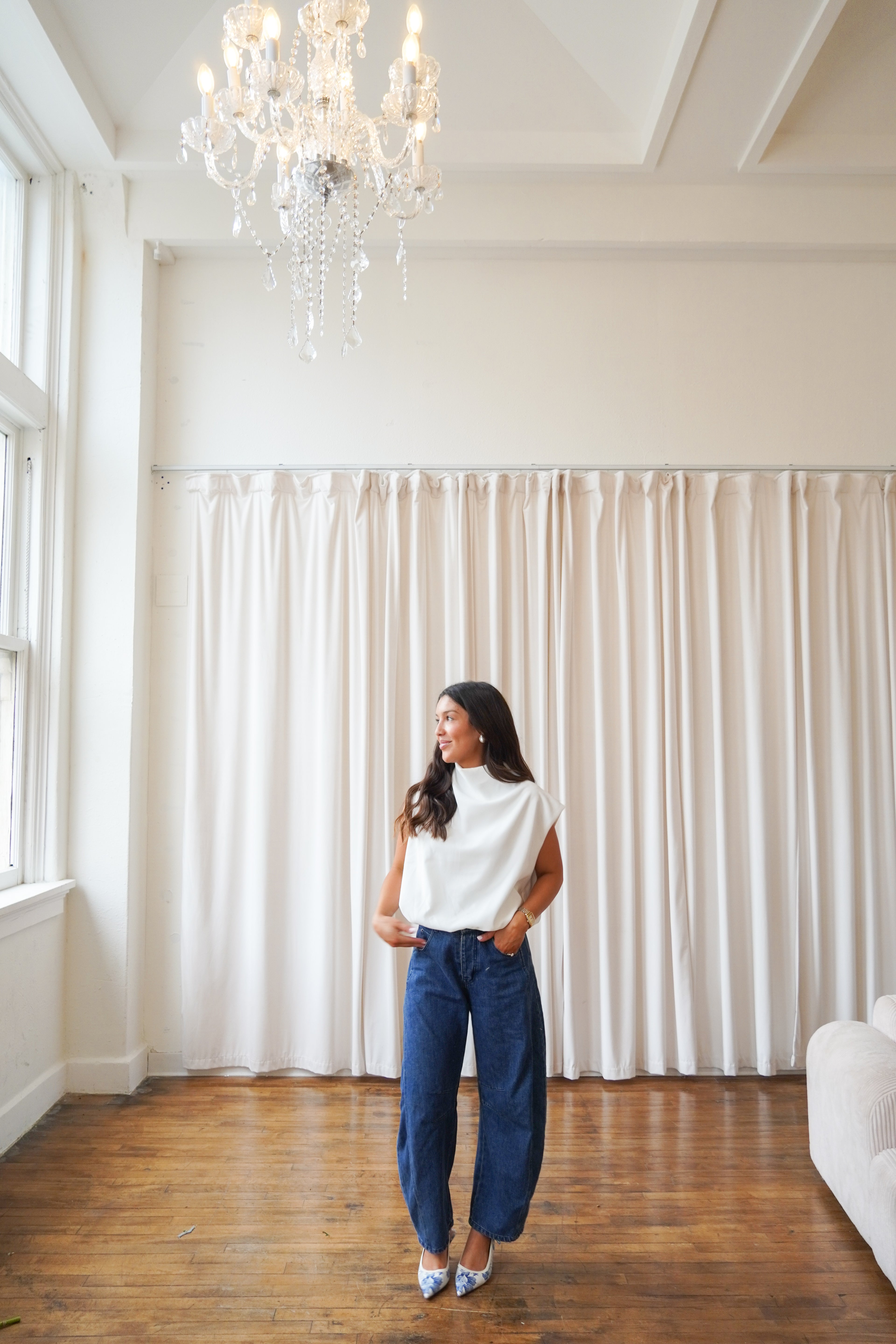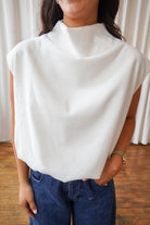 This top combines structured elegance with playful volume. The cap sleeves sit lightly on the shoulders, giving the upper silhouette a soft, refined frame and the draped mock neck adds a touch of sophistication. A classic white top for year around!