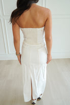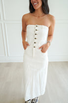 Featuring a strapless neckline, buttoned up top, and slit in the back-- this denim midi dress is perfect for country concerts, for your Saturdaygameday look, or dress it up with heels and a jacket over for a night out this Fall!