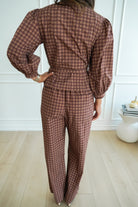 This brown plaid set has so many fun details! Featuring 3/4 ballon sleeves, an adjustable tie at the waist & adorable front buttons– this set is so festive for Fall!!