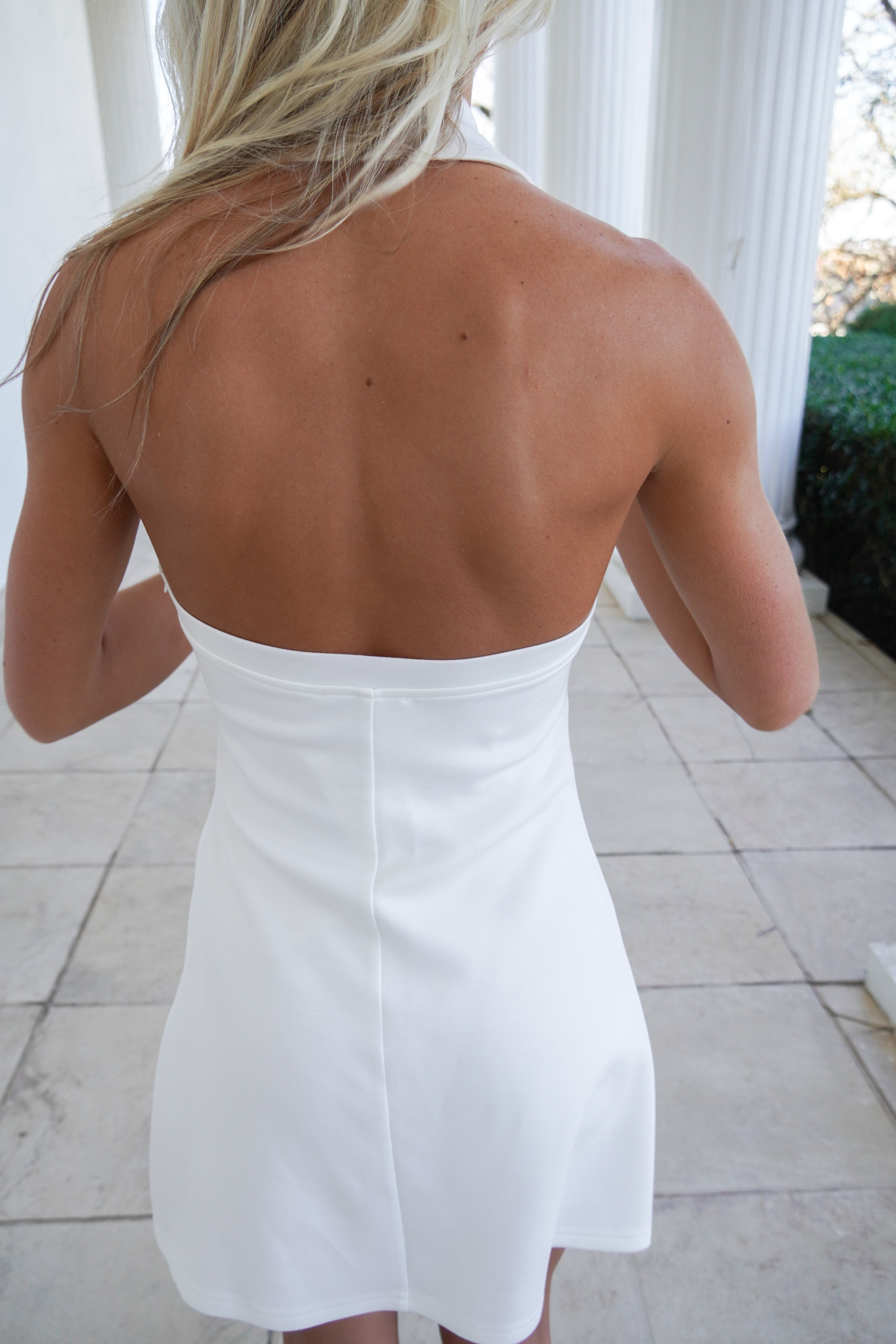 Featuring a halter neck, an exercise scuba-like material, and a cinched drawstring waistband at the skirt with pockets on the front. This is the perfect dress to golf in this Summer, to play pickleball, or an afternoon stroll. The most COMFY dress on!!