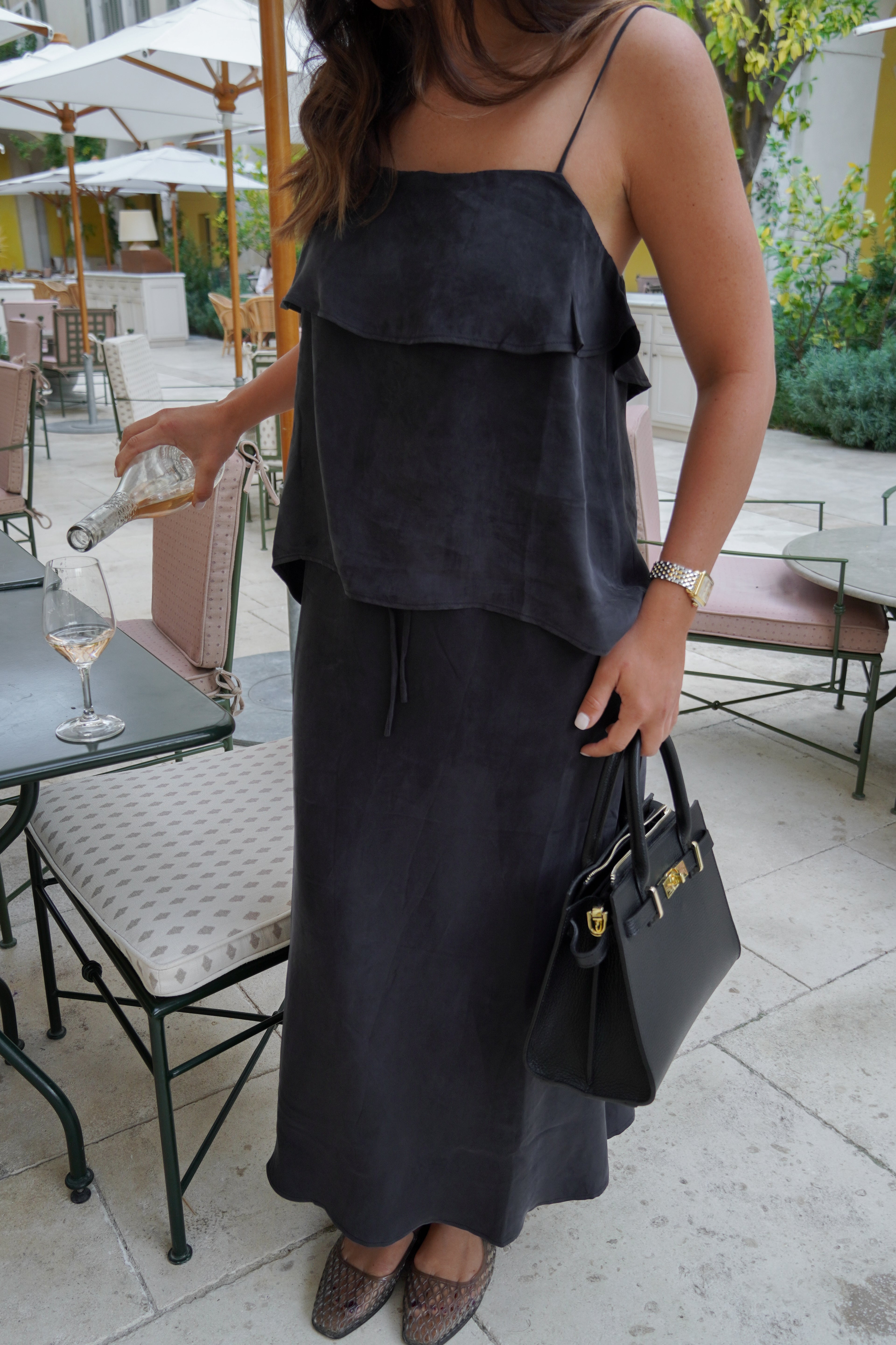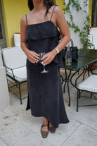 This set is your new favorite staple! We are obsessed with the fabric that makes this set look so expensive and elevated. The thin spaghetti straps and flowy top complete the matching midi skirt. Style it up for a night out with heels, or make it more casual with flats!