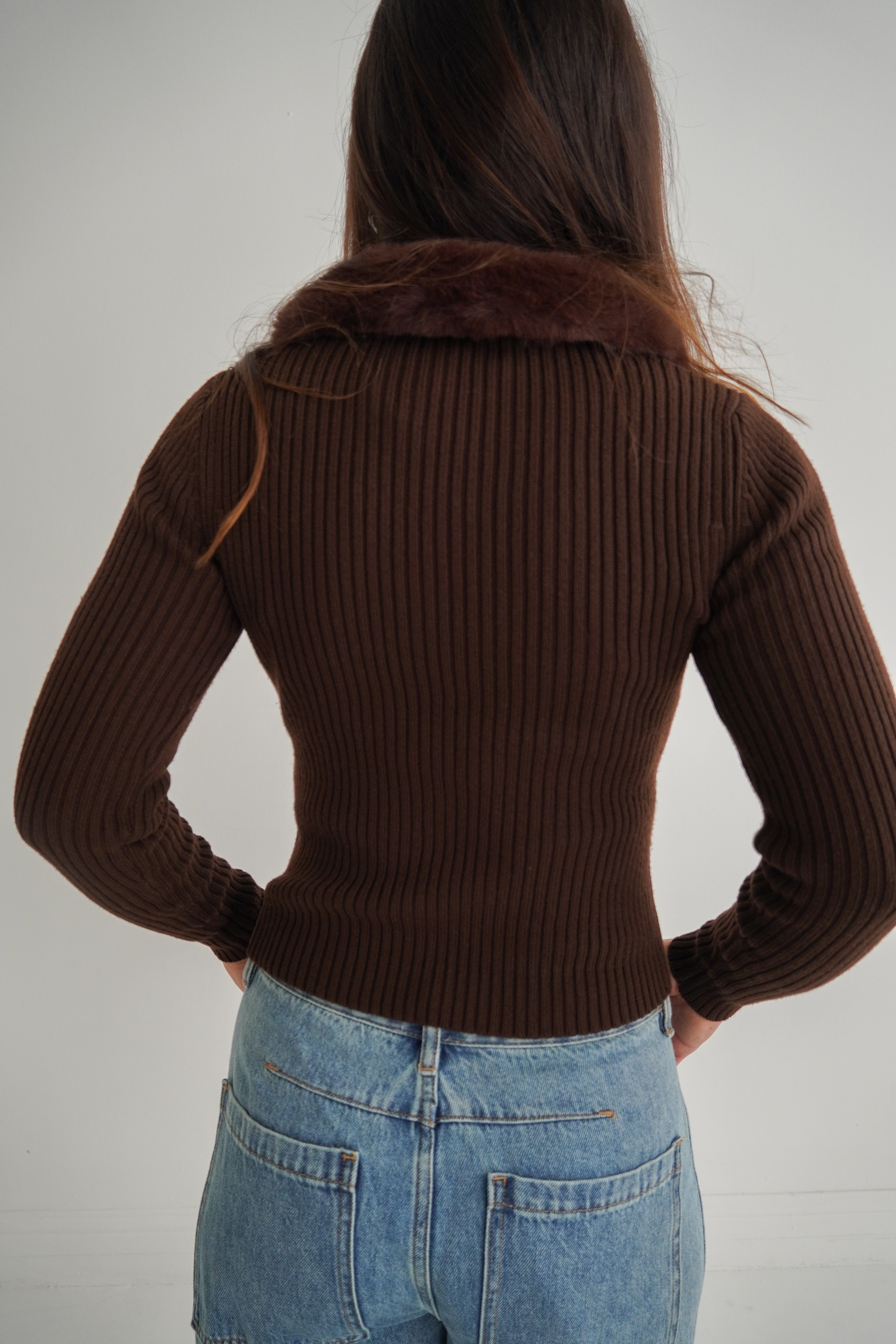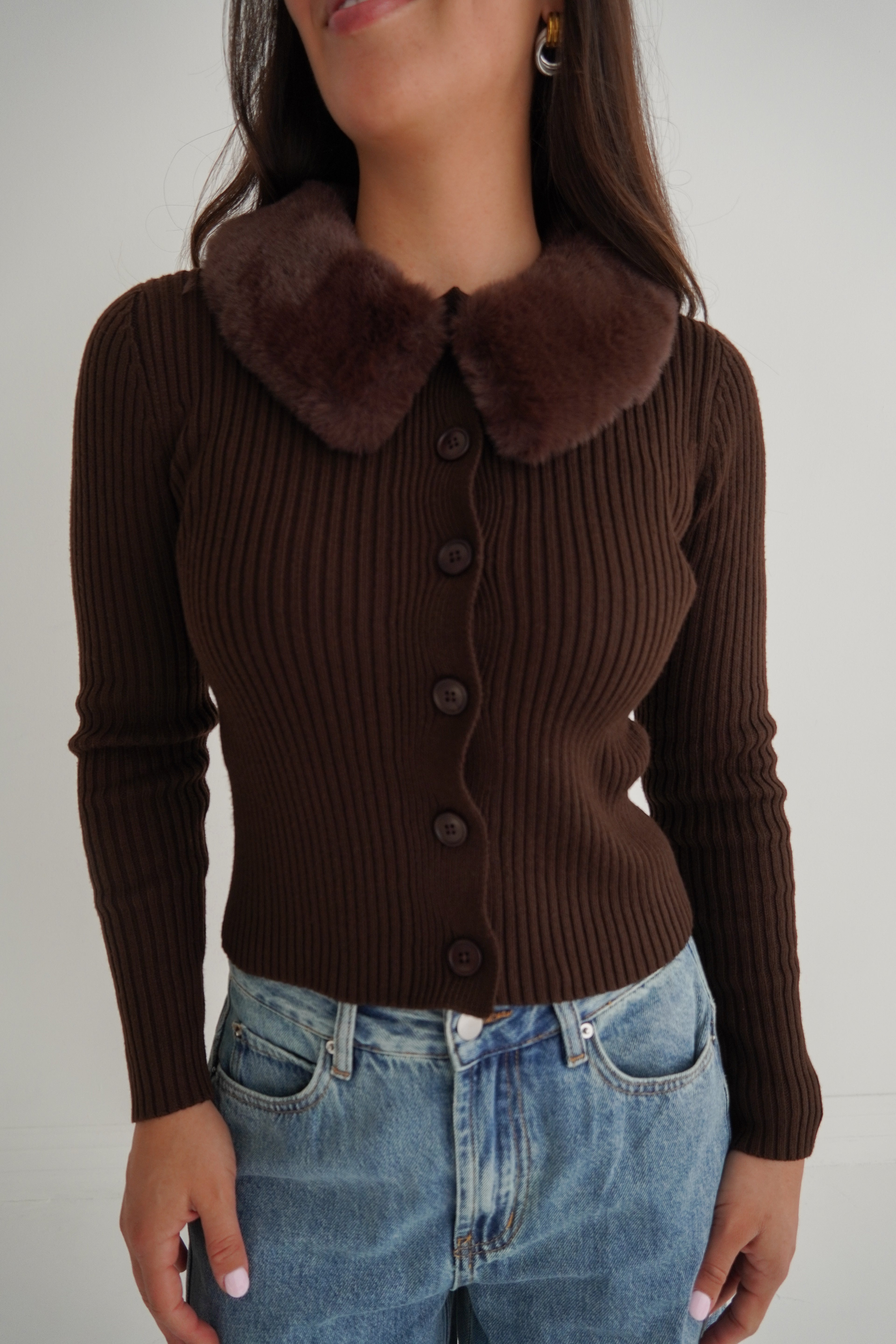 Cozy luxury! With this stunning chocolate brown sweater cardigan featuring a plush fur collar that's even cozier than it looks. Long sleeves keep you warm while the soft, touchable collar elevated any outfit instantly.