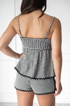 We're loving the ricrac trim on this adorable houndstooth set!! Features adjustable straps, a peplum hem and mini shorts.