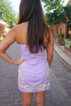 Made with a linen-cotton blend, this strapless dress is a showstopper-- the prettiest lavender color with floral detailing and foldover neckline! Ideal for date night, a formal, or a fun party!
