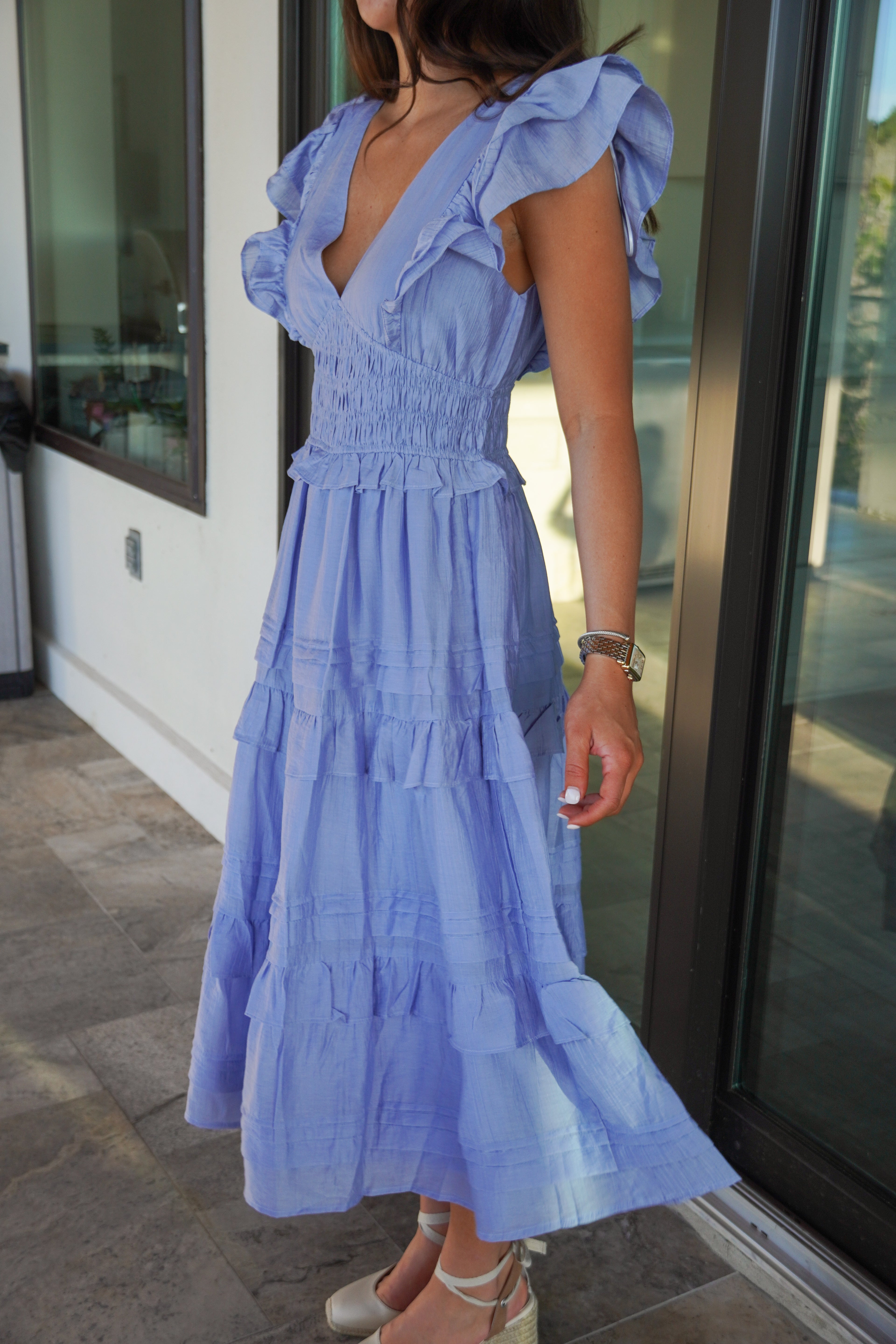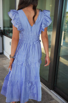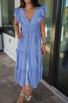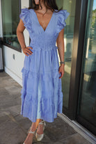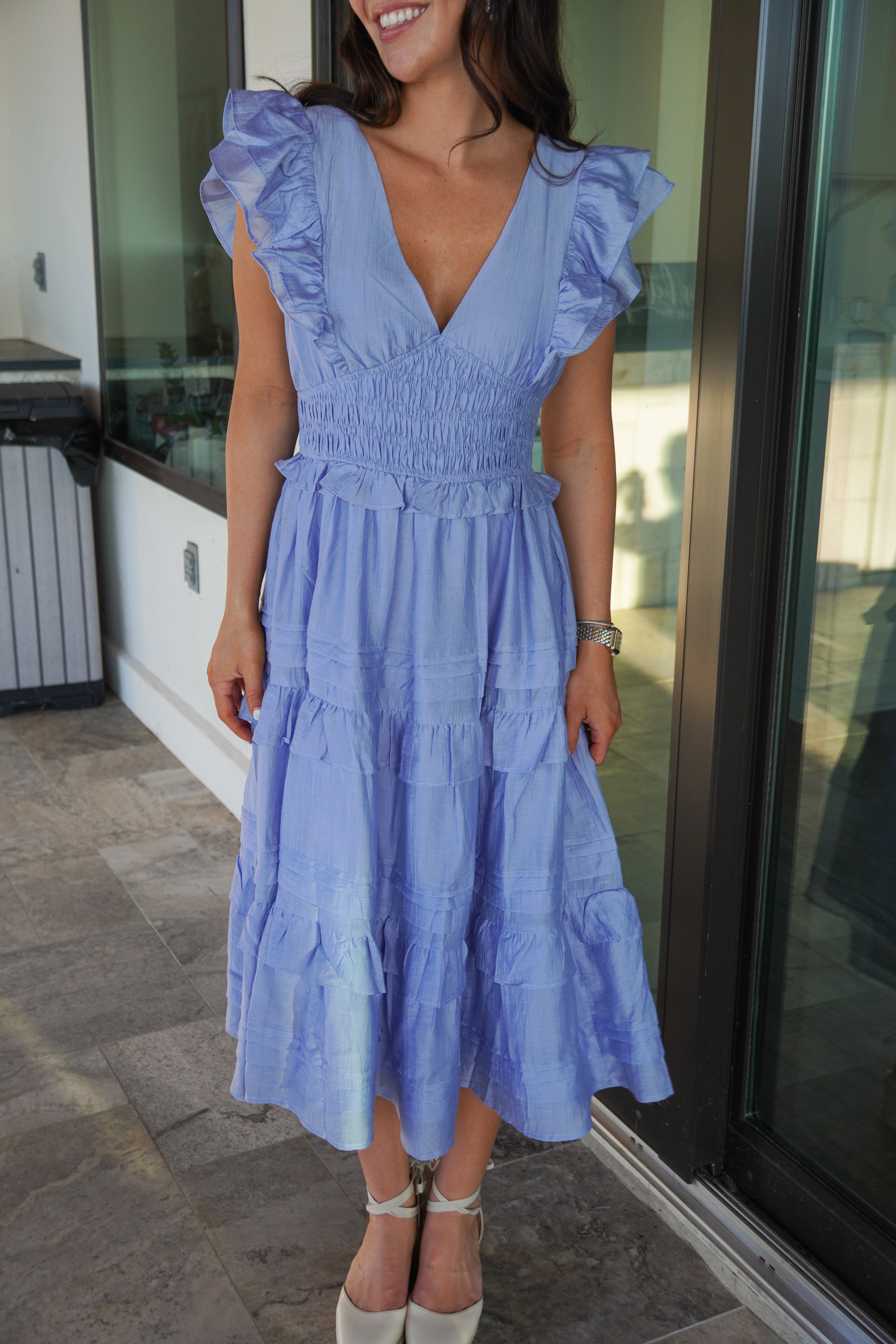 - Featuring a smocked waist, ruffled skirt and ruffled cap sleeves, this beachy blue midi dress is adorable for your next party, Easter, or event!
