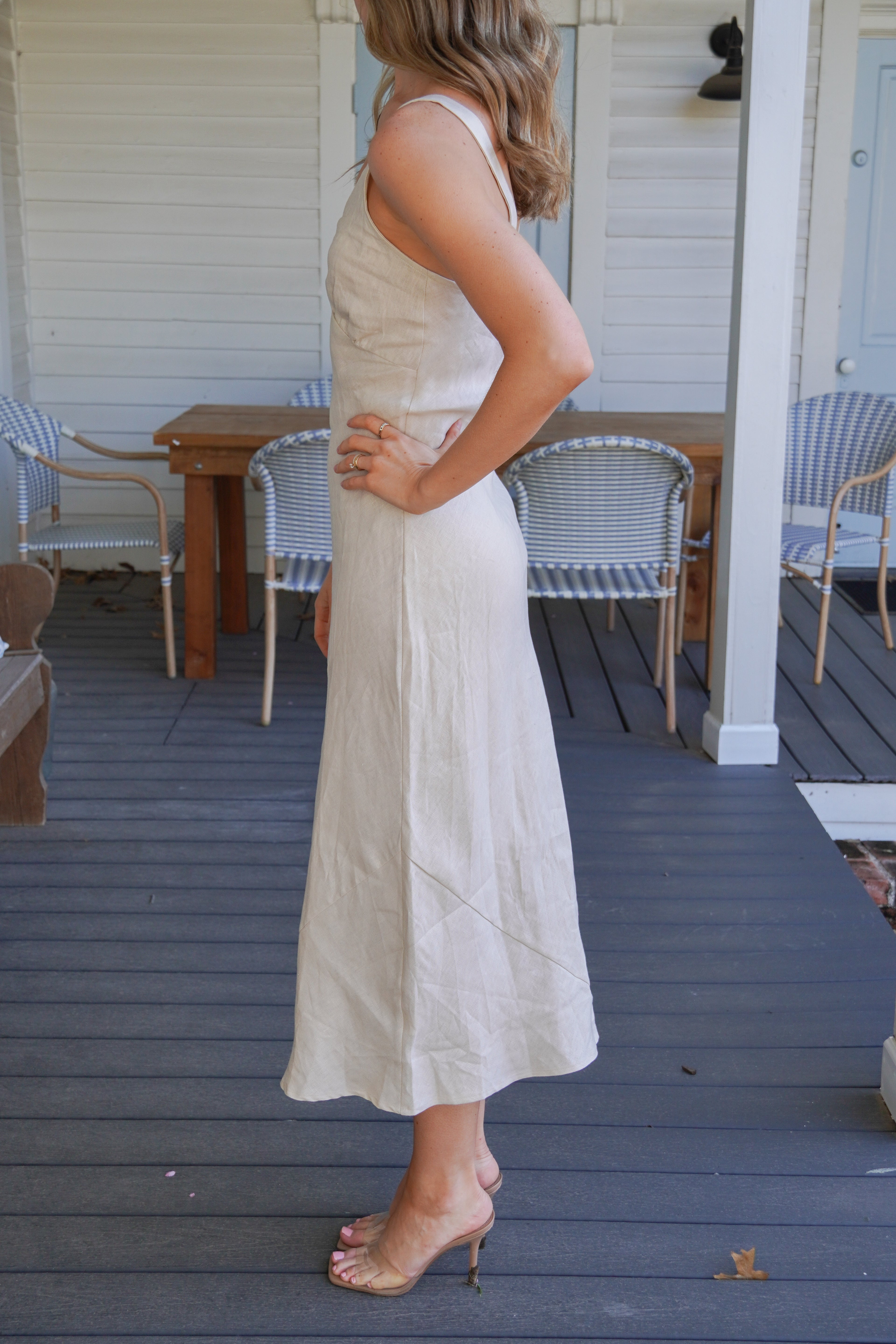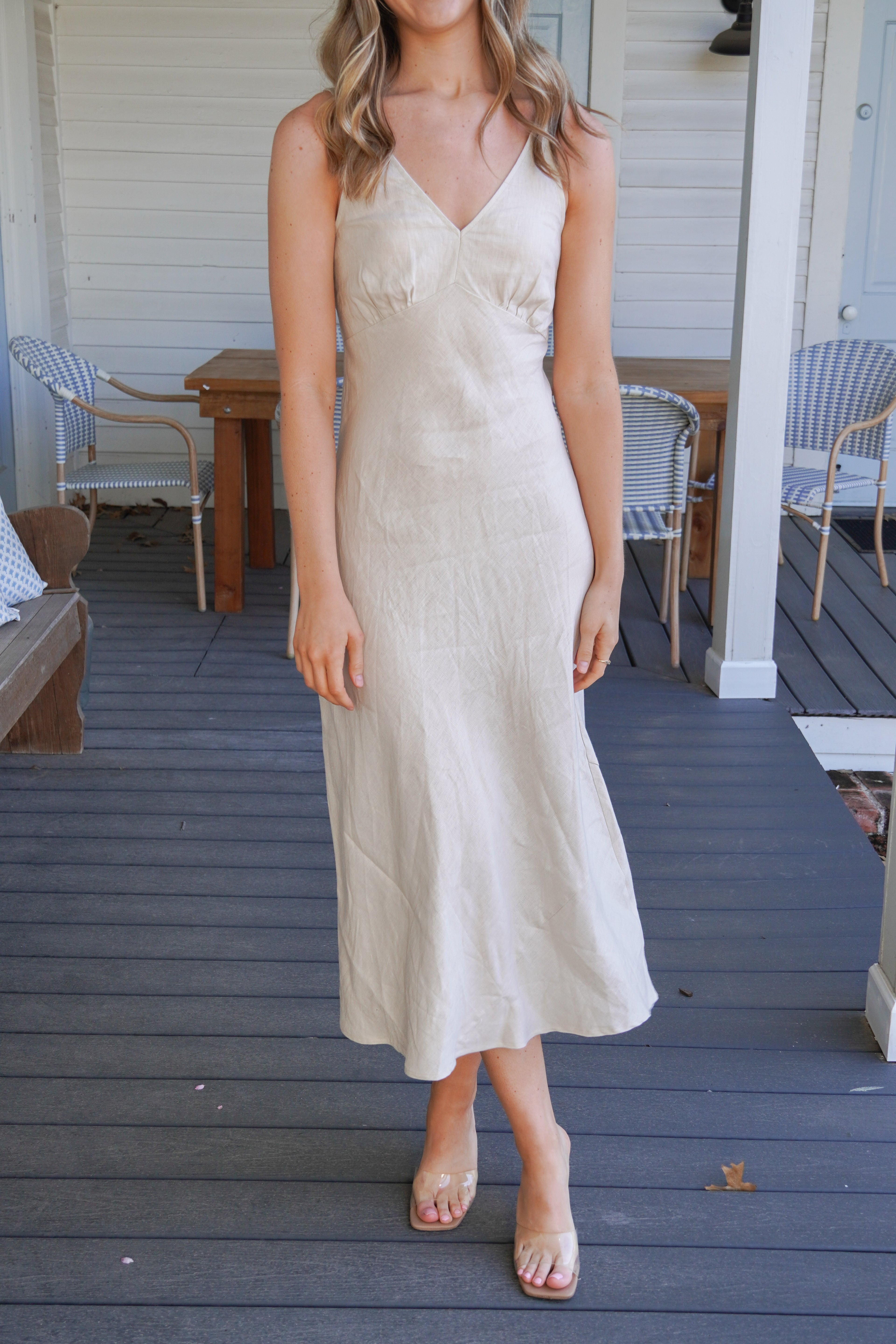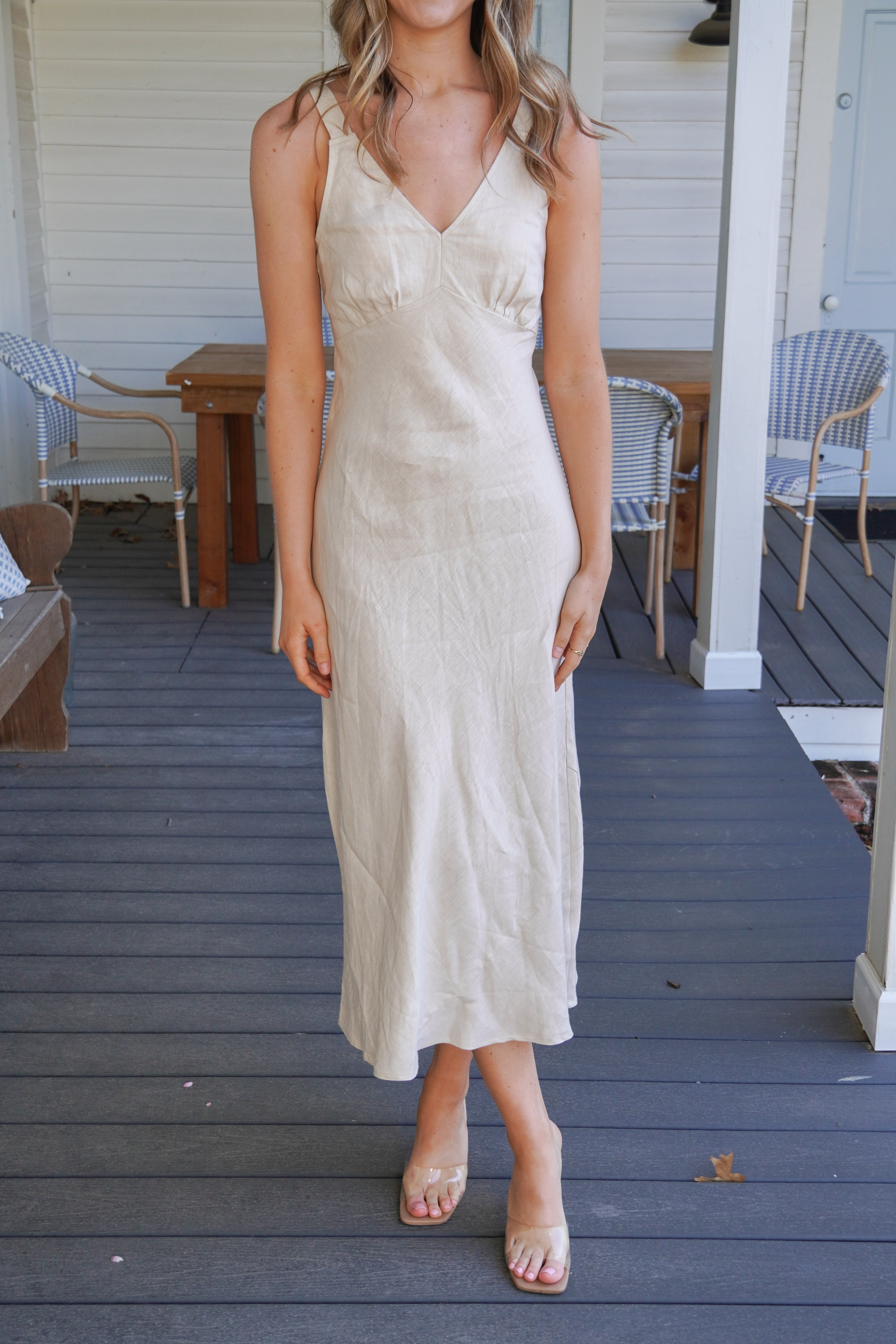 - Featuring a light linen and an oatmeal color, this midi dress is perfect for your everyday Spring and Summer wear-- style it down with sneakers or up with heels for a dressier day out!