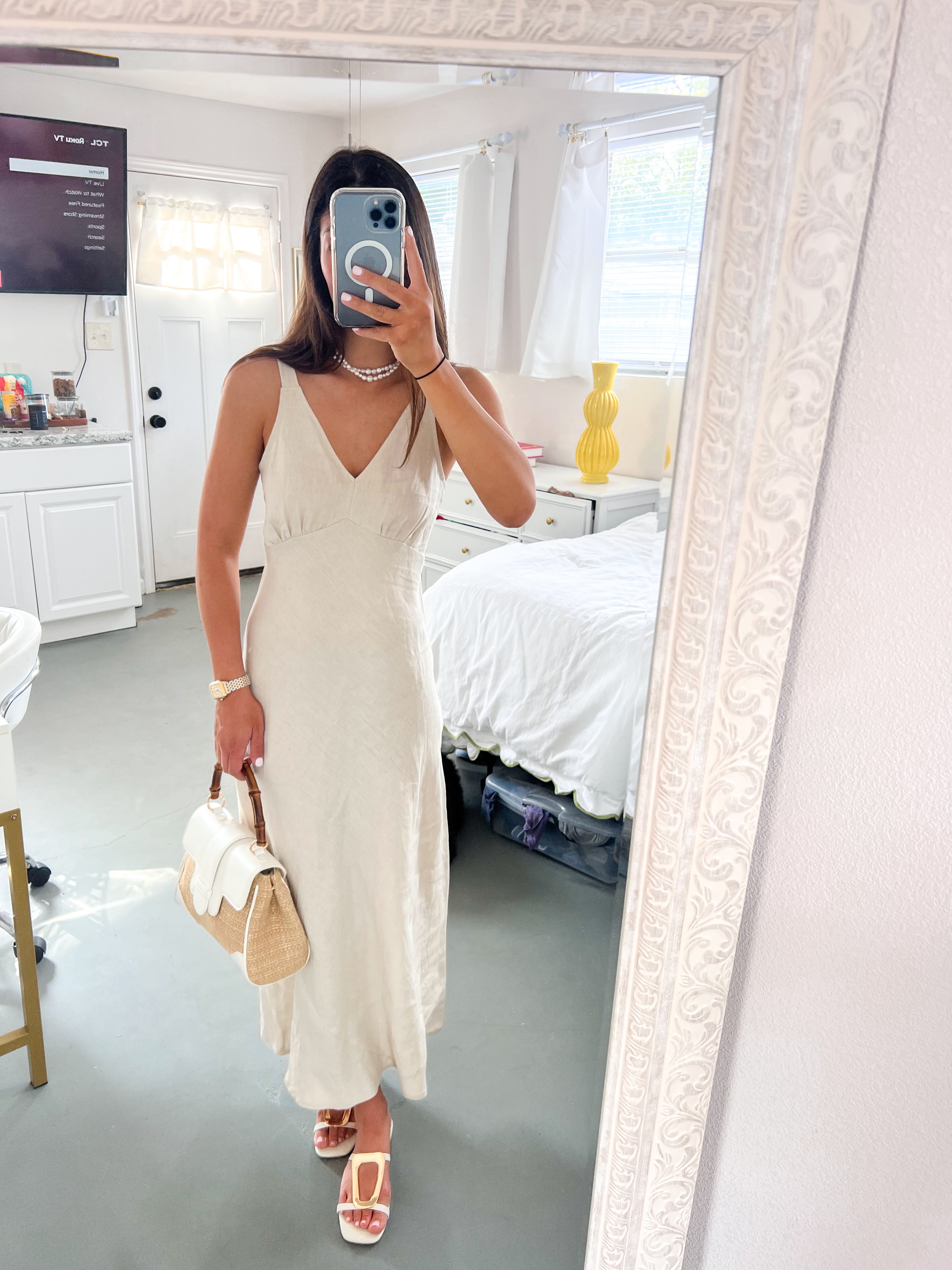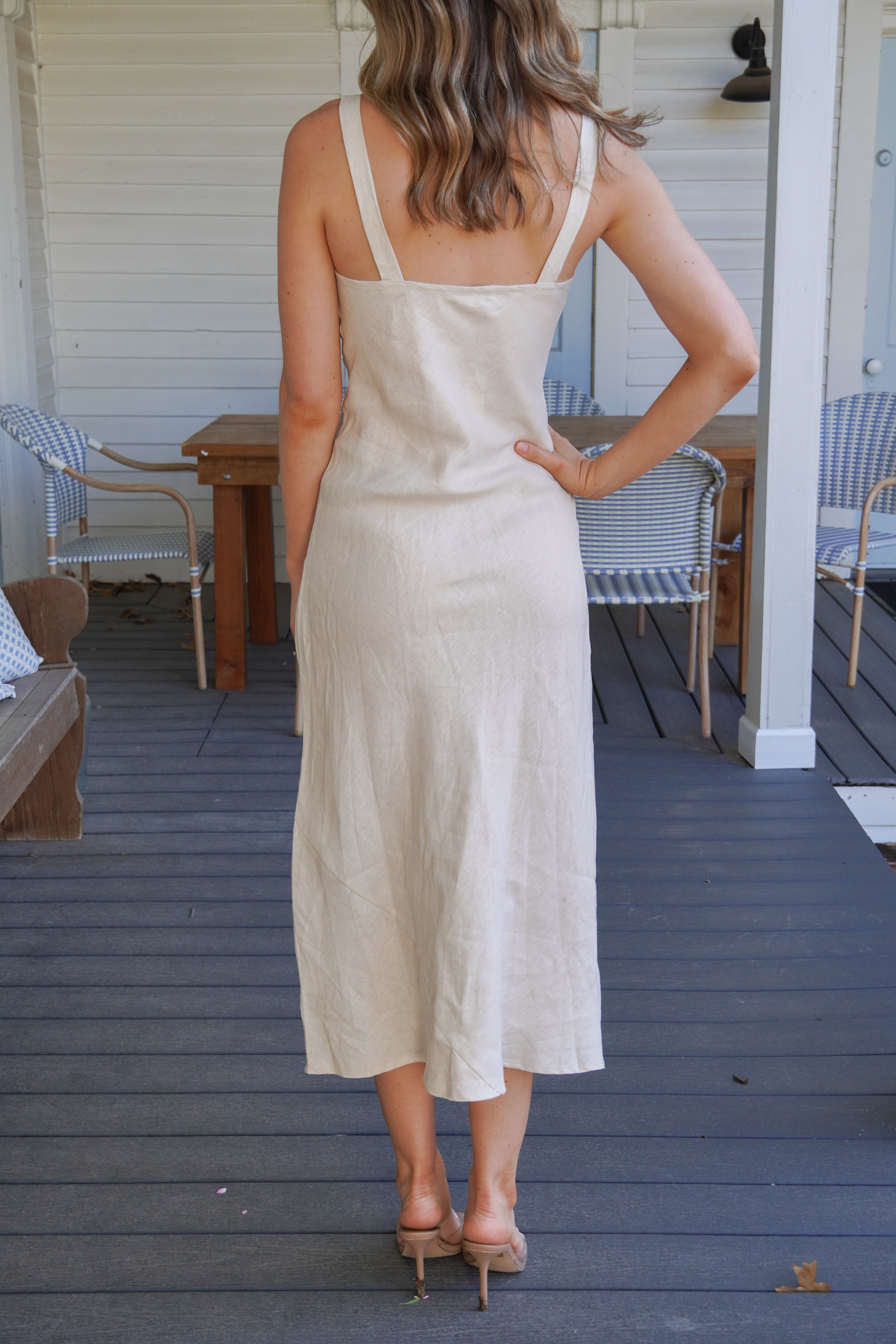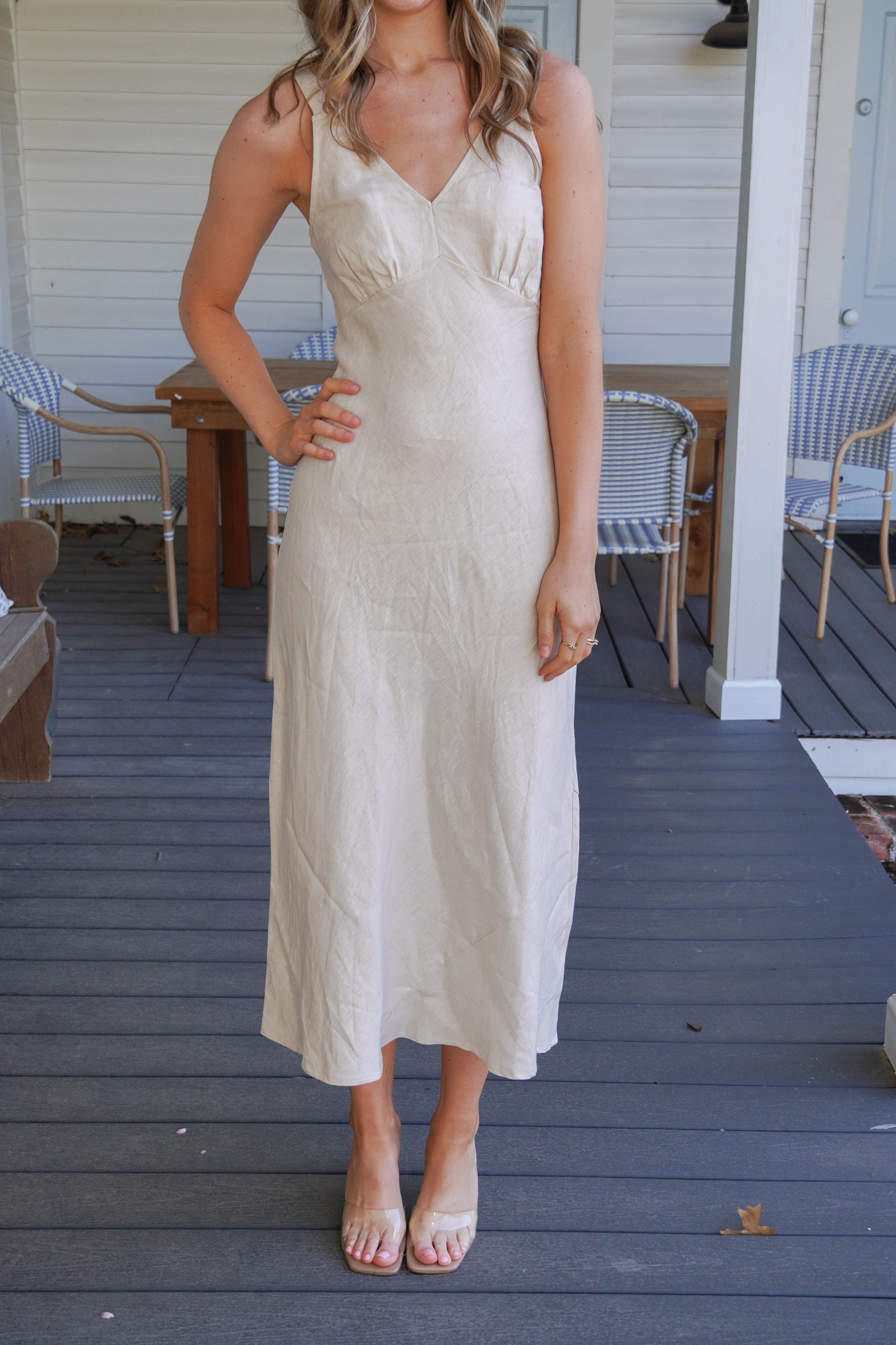 - Featuring a light linen and an oatmeal color, this midi dress is perfect for your everyday Spring and Summer wear-- style it down with sneakers or up with heels for a dressier day out!