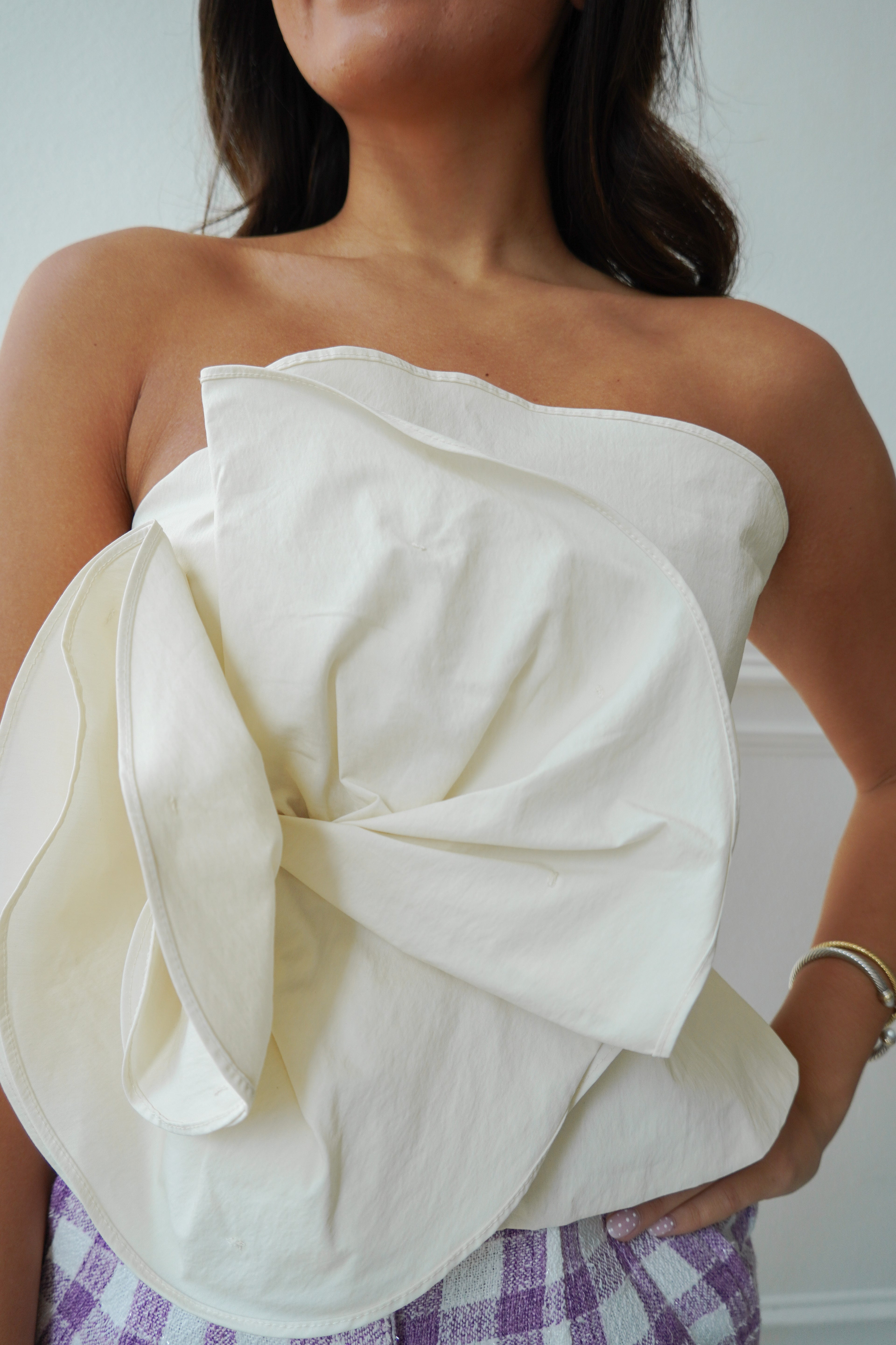 We are just in LOVE with this cream strapless flower top! Features the most darling floral detail on the front & straps that you can add for extra support.