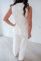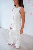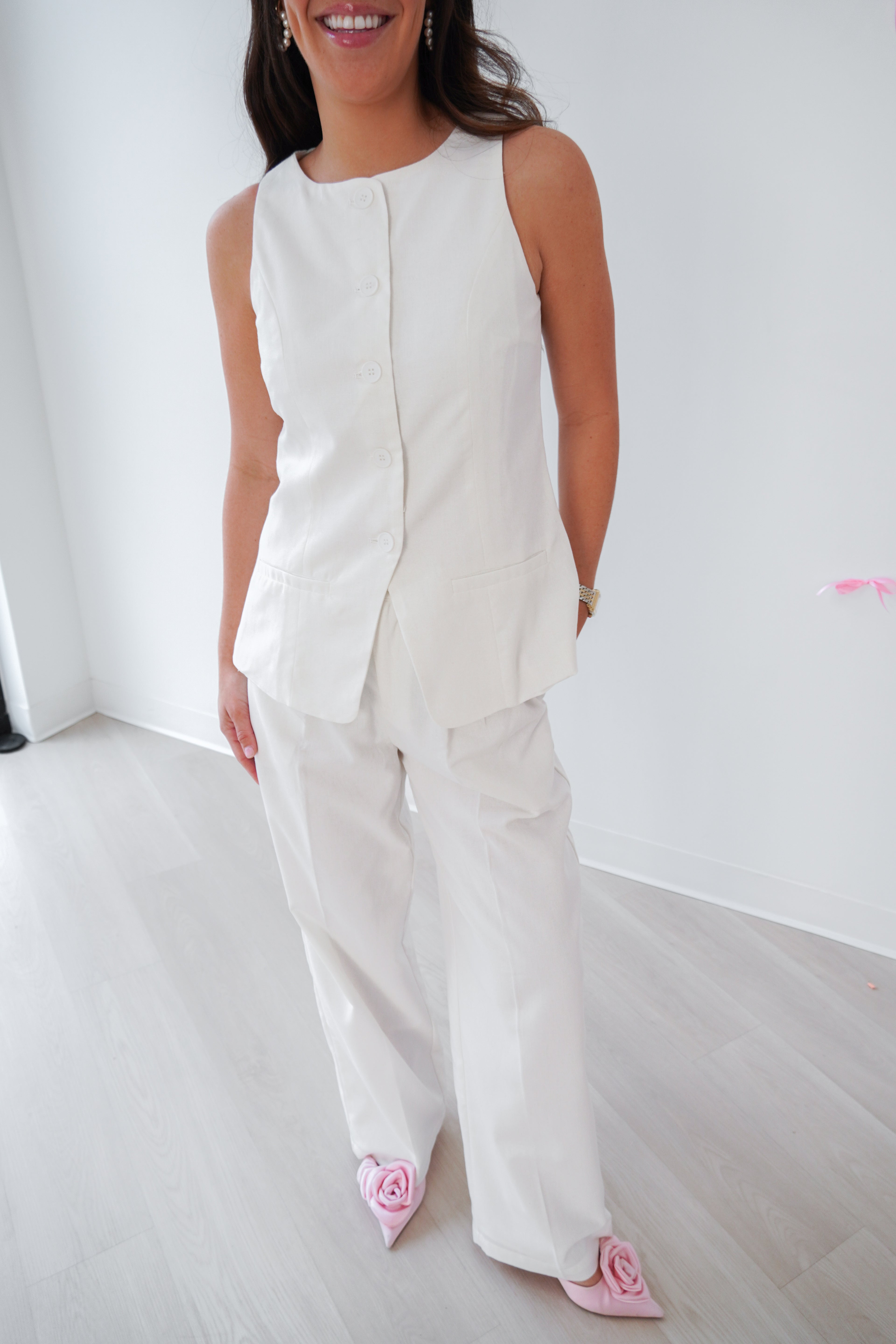 Featuring a sleeveless button-up vest and matching wide-leg pants with pleats at the top-- this linen set is crafted from a lightweight, breathable fabric, offering the perfect balance of comfort and refinement. The relaxed yet tailored silhouette makes it ideal for warmer days this Spring and Summer-- delivering a chic, laid-back look with a touch of modern elegance.
