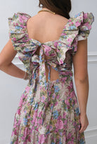 - This dress is GORGEOUS! With ruffled flutter sleeves and the prettiest floral pattern, this dress is a statement and such a fun dress this season! THE BEST PART-- THE BACK!!!!