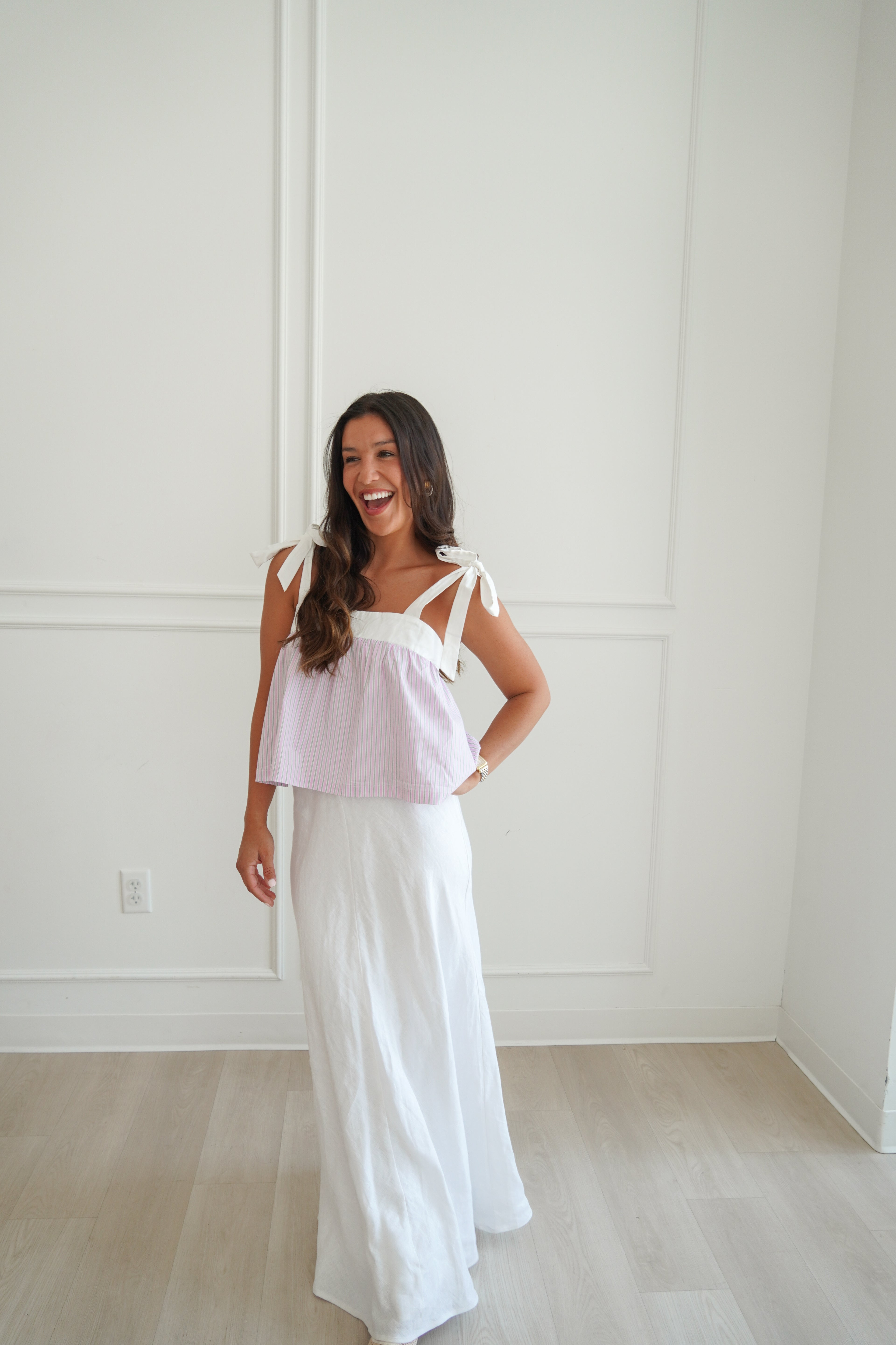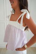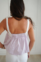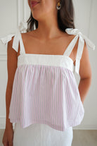 This darling pink top will bring such a fun pop to any outfit! Featuring green & white pinstripes & adjustable ties at the straps- you can't go wrong with this one.