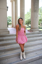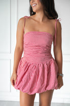 This darling mini dress is just to die for!!! Featuring a ruched bodice, adjustable ties at the straps, and a fun bubble skirt– you are sure to be the talk of the tailgate in this adorable look!
