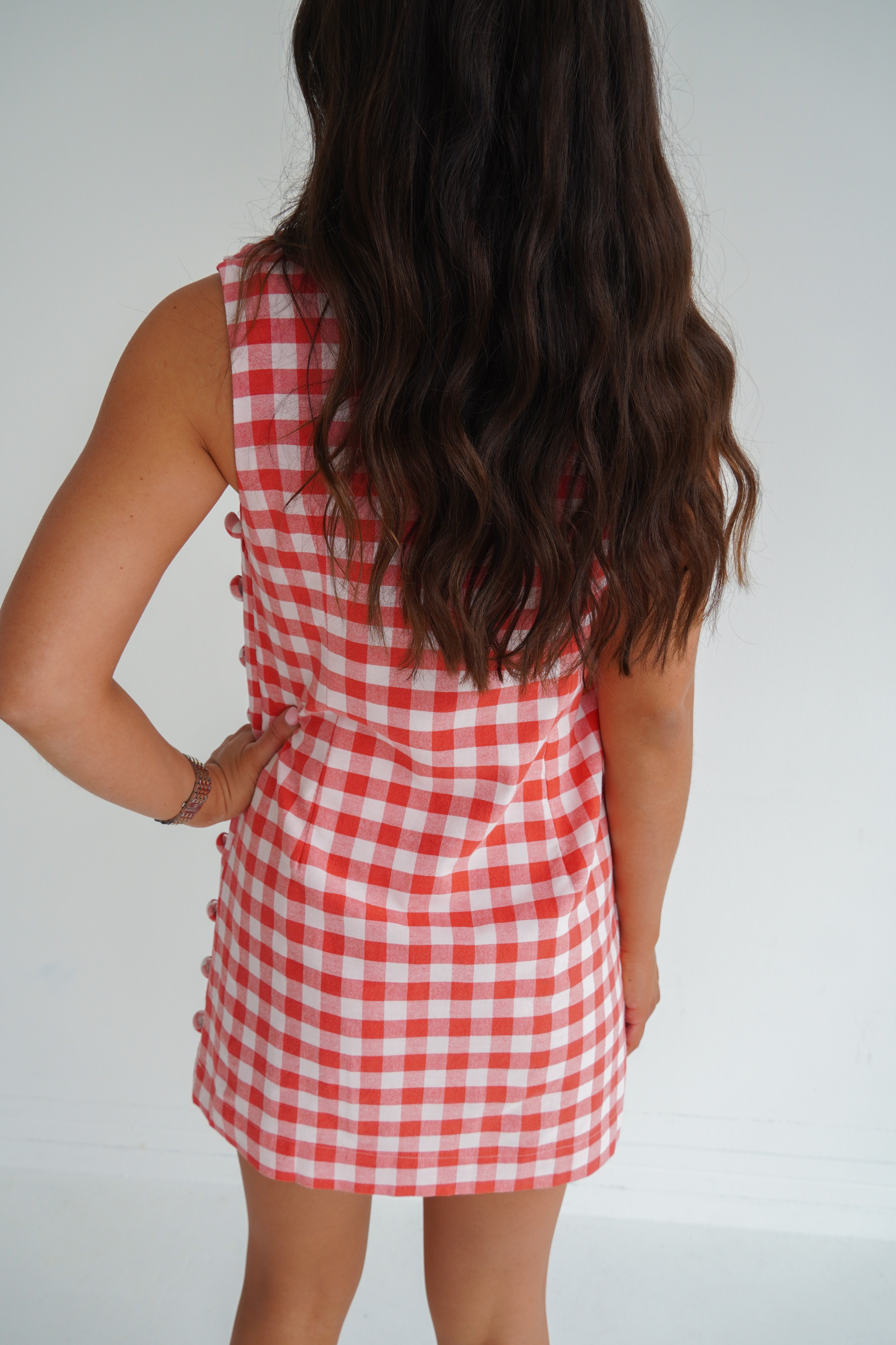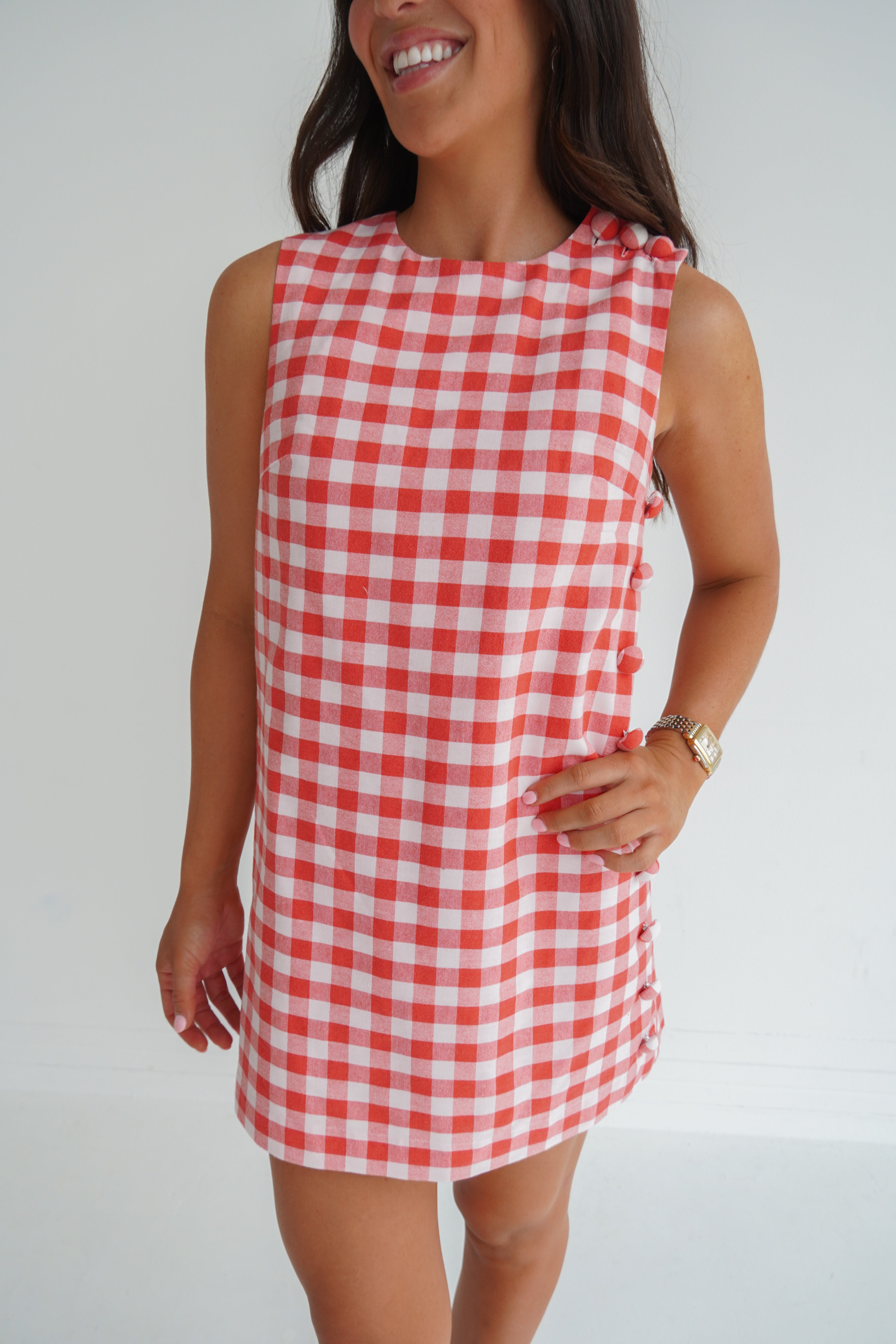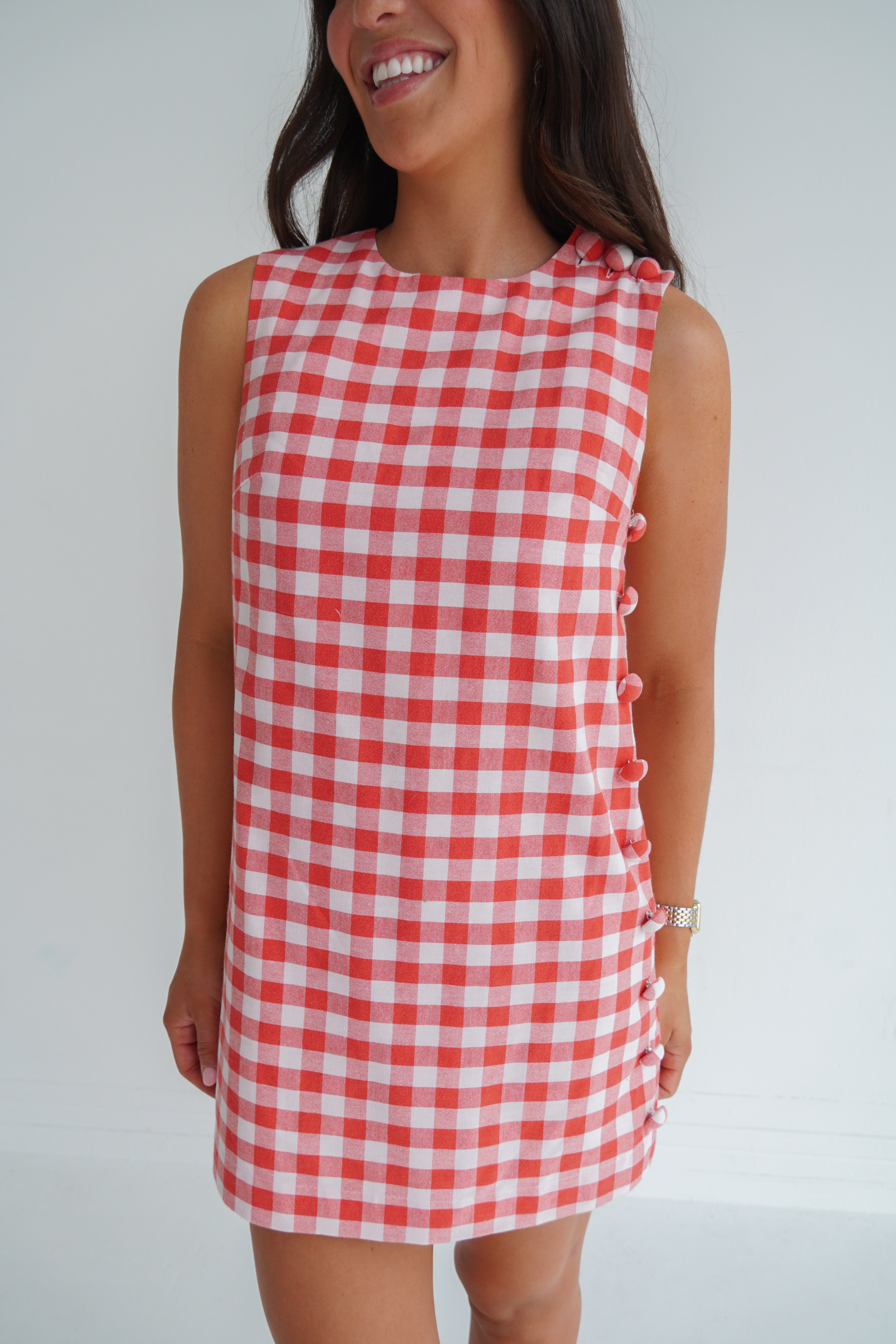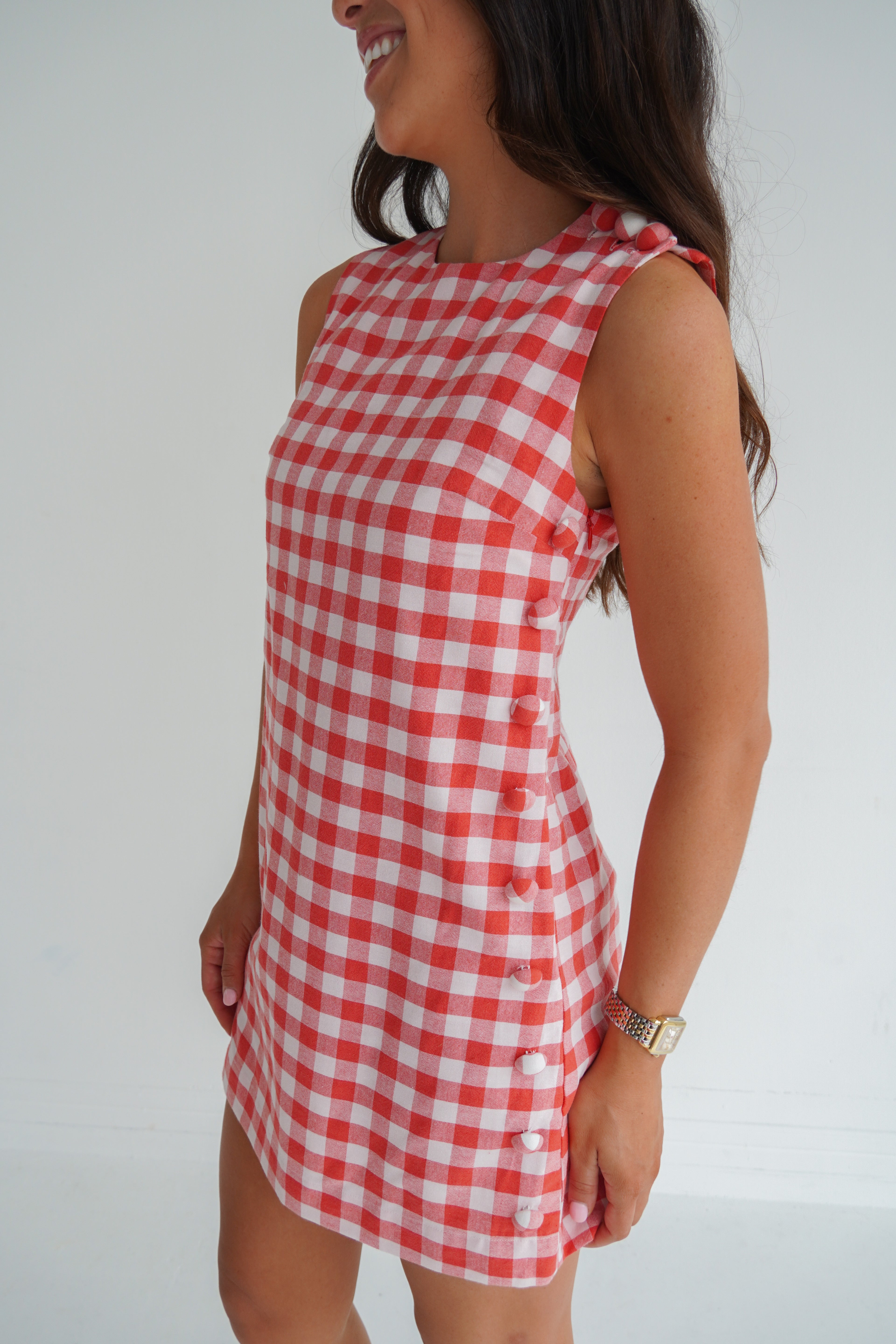 Featuring a red and white gingham, a scoop neckline and buttoned detailing at the shoulder and along the side, this mini dress is a classic fit and so darling for all season long!