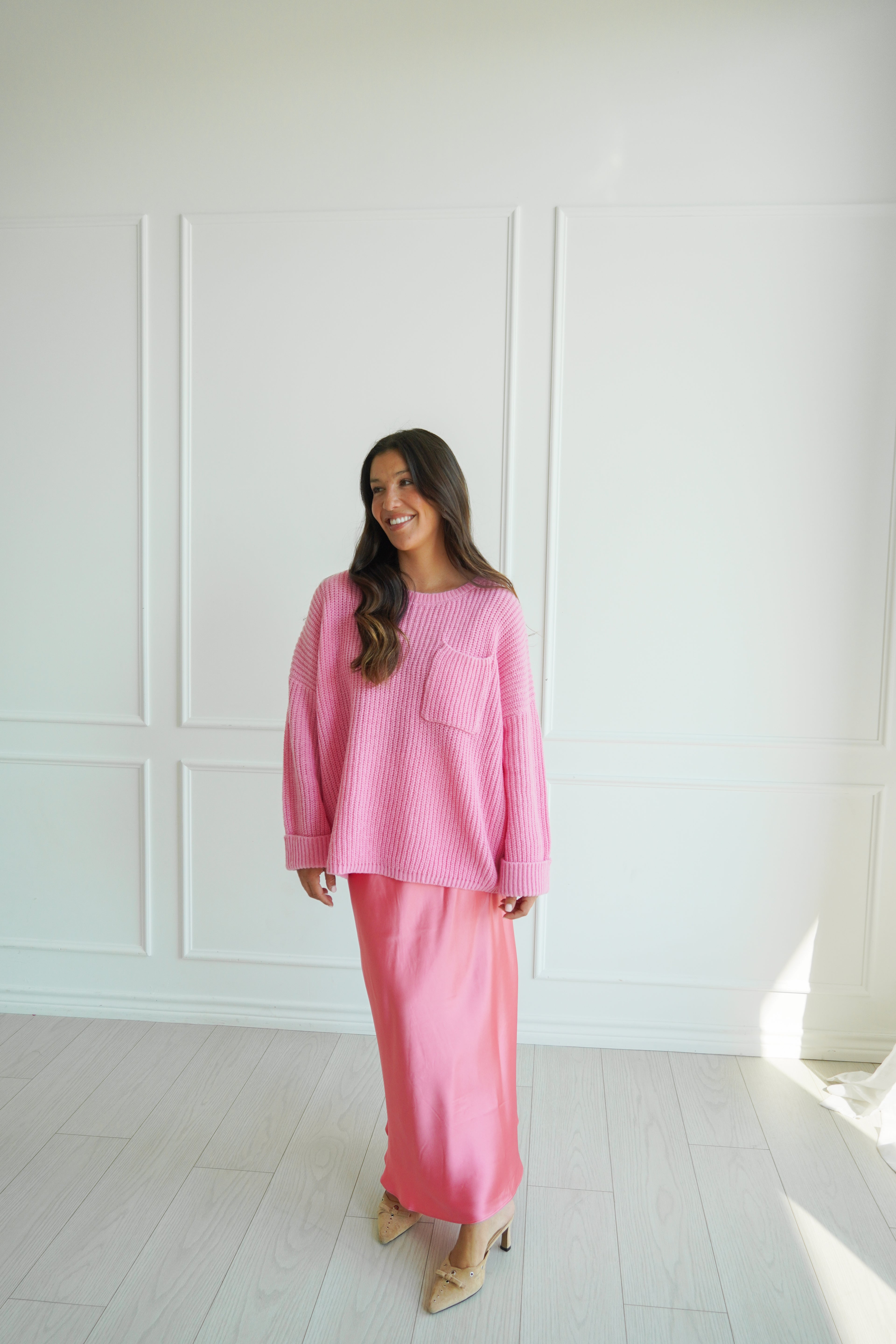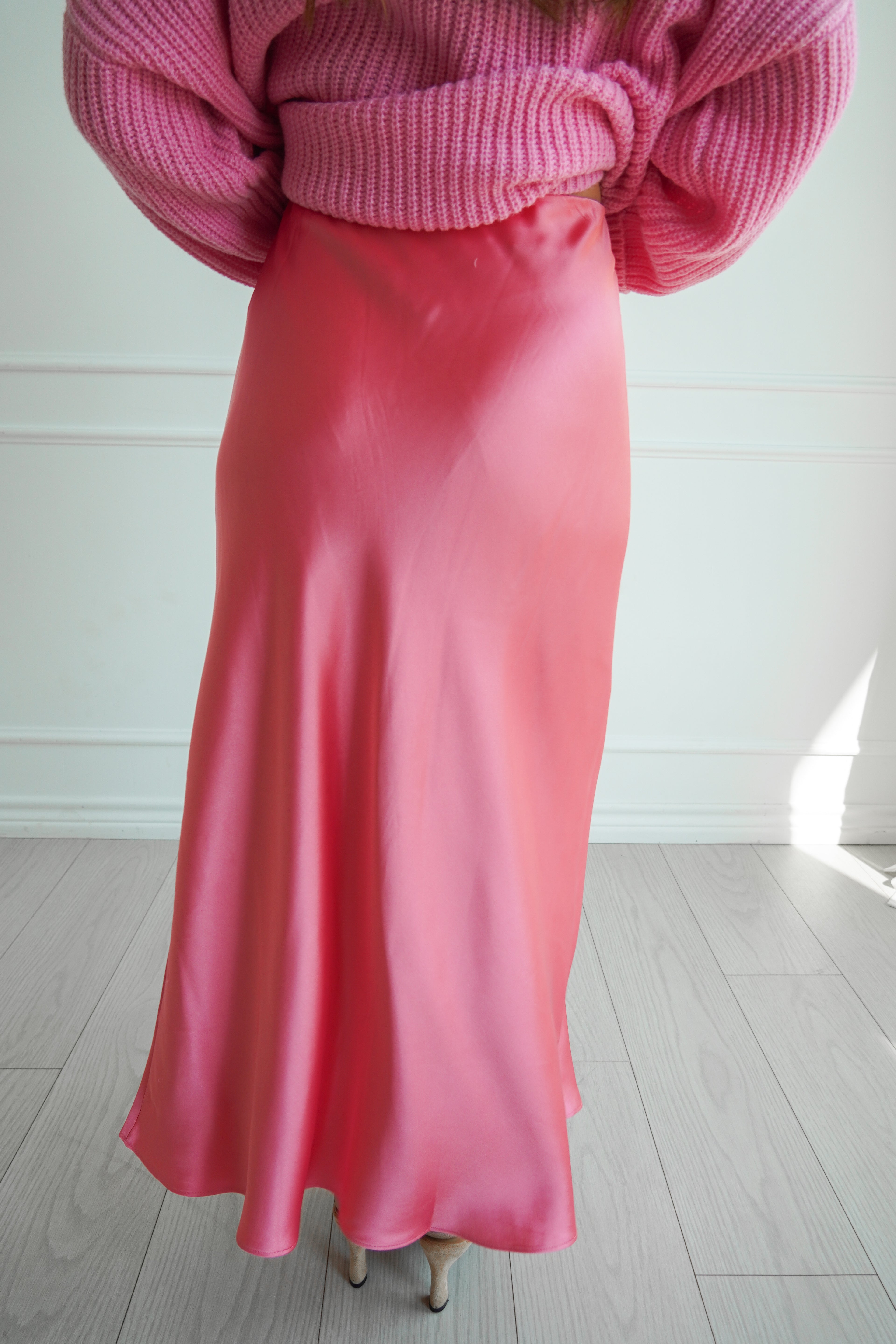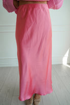 Featuring the prettiest pink color, a satin-like fabric and a drapey fit-- this maxi skirt is flattering and the most FUN pop of color for your wardrobe!