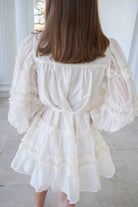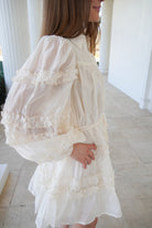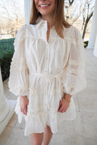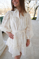 A fun and playful ruffled ivory mini dress!! With button closures along the front, long puff sleeves, and an adjustable tie at the waist, this dress is perfect for Spring or the bride-to-be!! We are obsessed with how feminine this dress is!