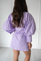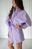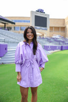 Featuring exaggerated balloon sleeves, the prettiest lilac purple, and ties at the waist that cinches, this dress is so classy with a fun and unique twist-- we love it for a fun gameday pick styled up or down— or a night out!!