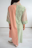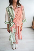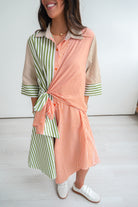 Featuring a fun green & orange stripped midi dress, with a collared neckline, wide 3/4 length sleeves, and tie detail at the waist. Flattering on all body types!!!