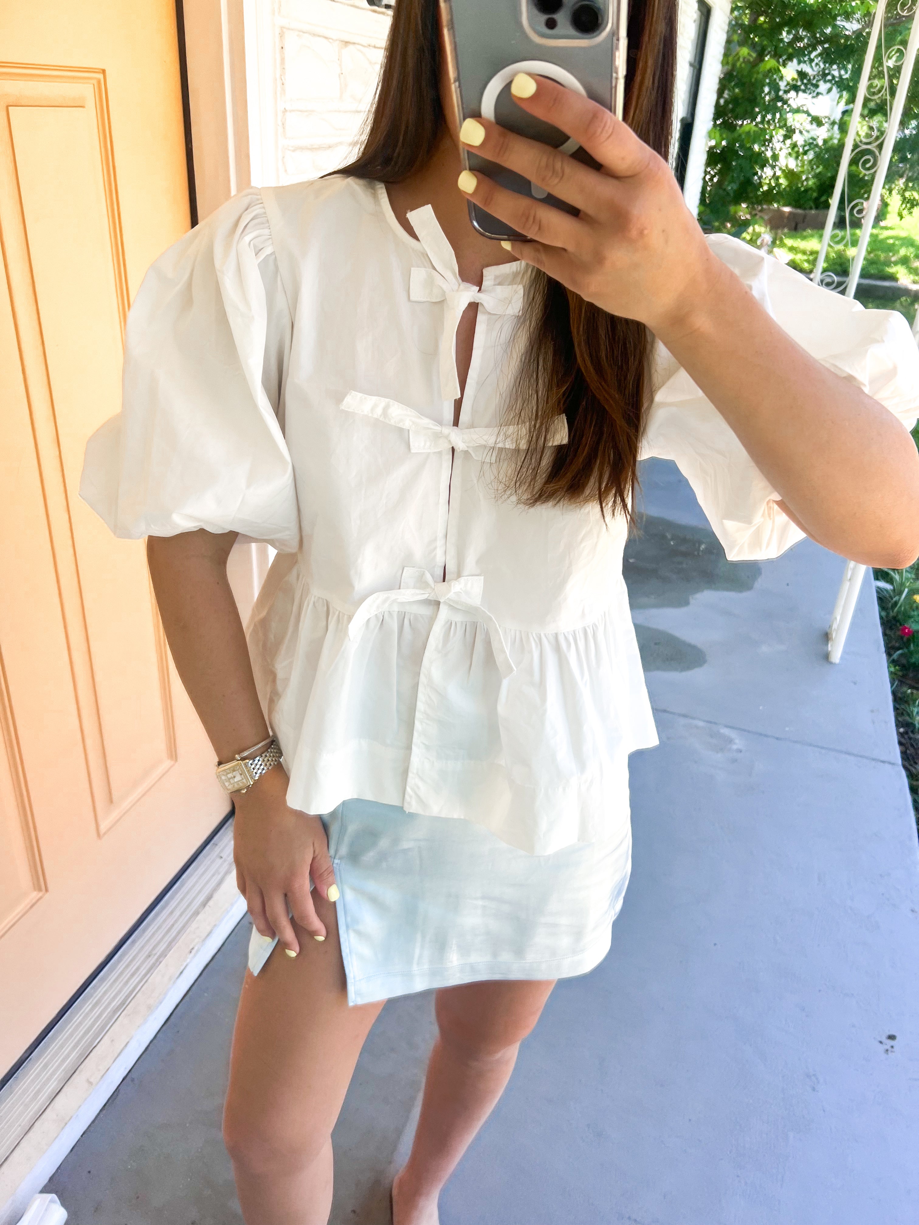 - Featuring puff sleeves, a light denim and white stripe, and ties along the front, this top is our owners favorite! We are wearing this one all year long-- for all the occasions!