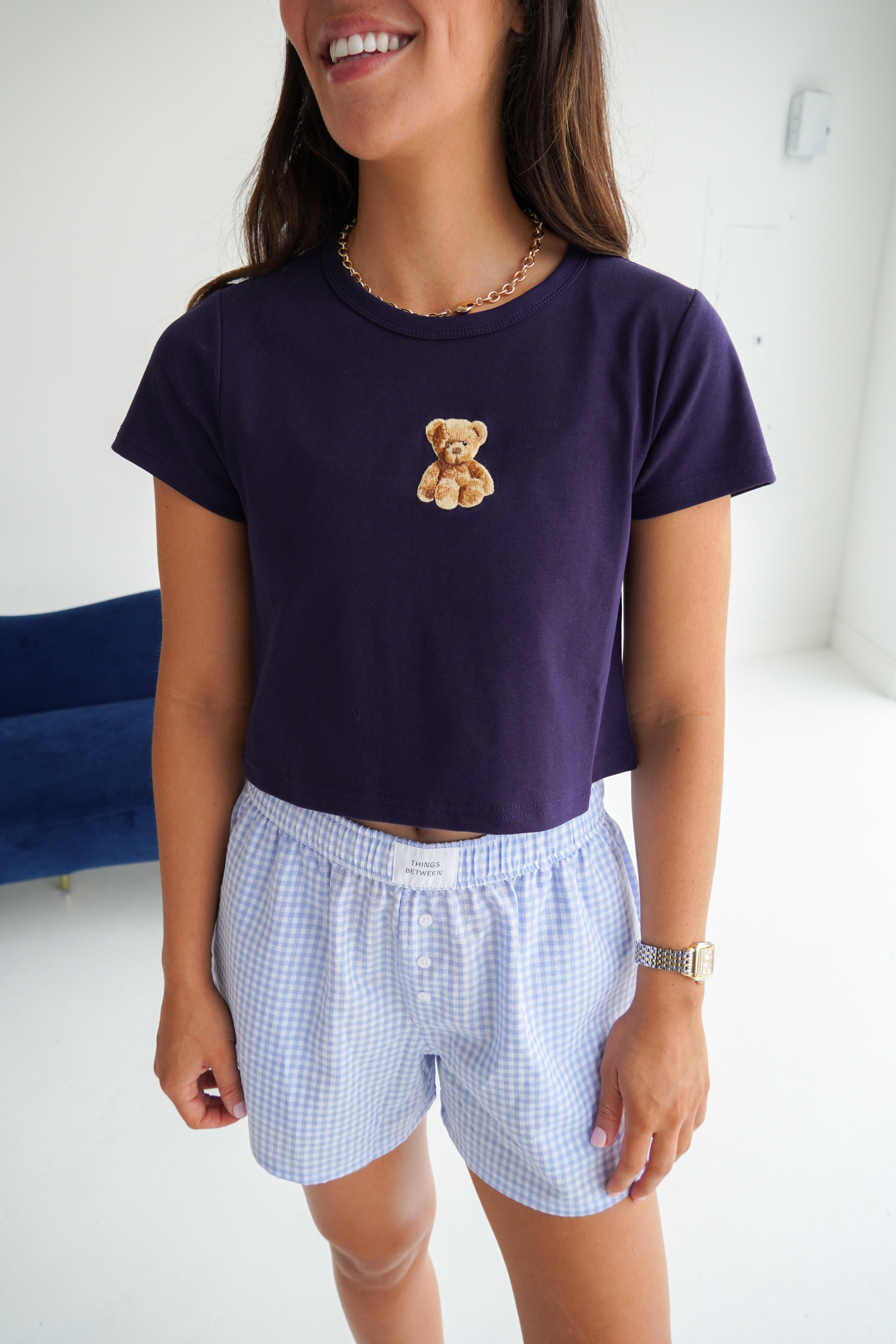 This navy baby tee is a playful and cute addition to your wardrobe. Made from a soft cotton, it's both comfortable and flattering. The standout feature is the small, adorable teddy bear embroidered on the front, adding a fun touch to the classic navy color-- giving a Ralph Lauren feel. Perfect for casual outings or layering, this tee brings a fun, youthful vibe to any outfit!