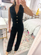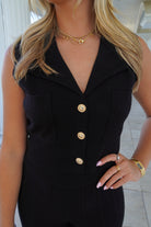 Featuring a soft knit fabric, gold button detailing, and a collared neckline, this black set is stretchy, comfy and versatile-- easy to style down with sneakers or up with heels for a night out! We love how easy and effortless this look is!