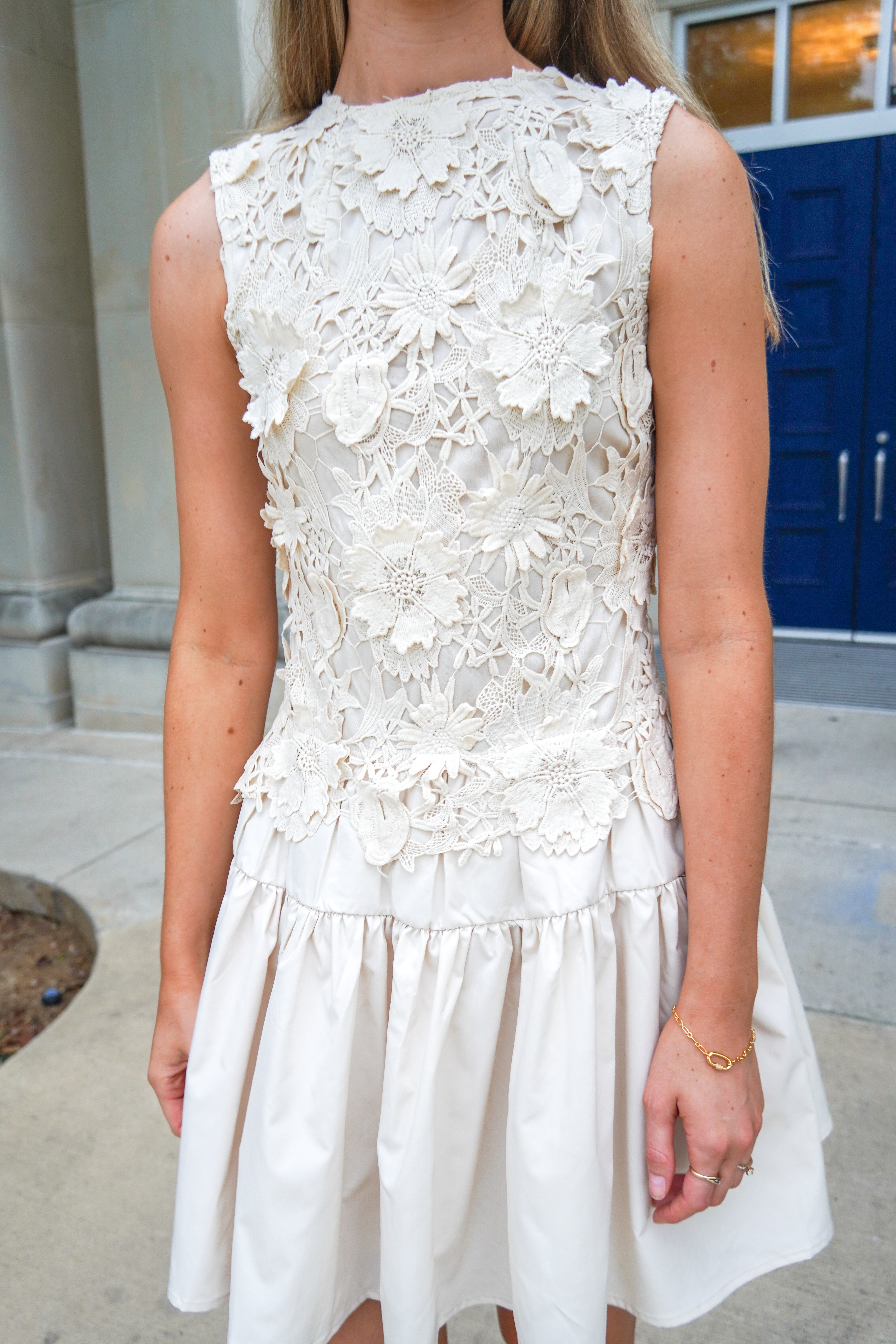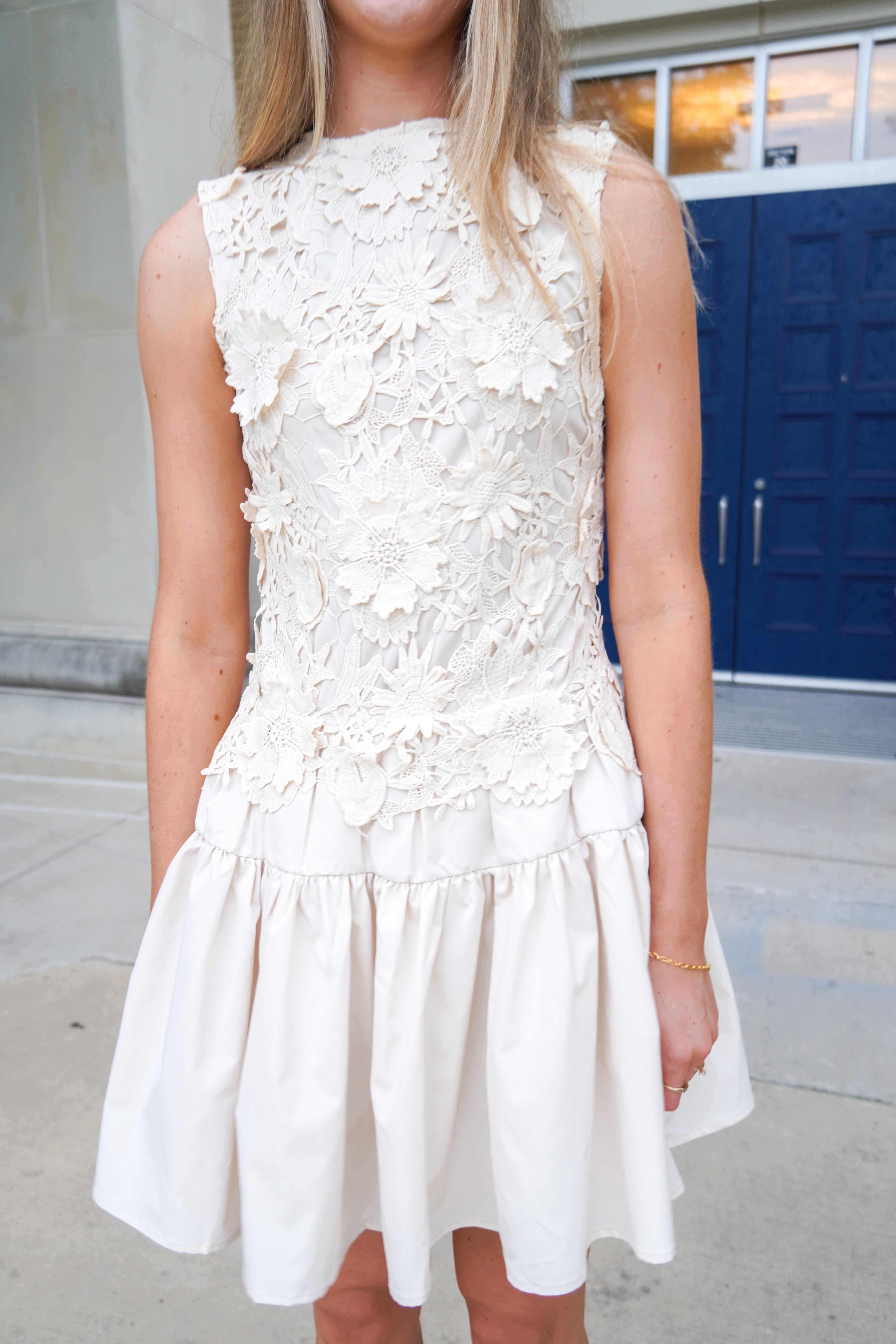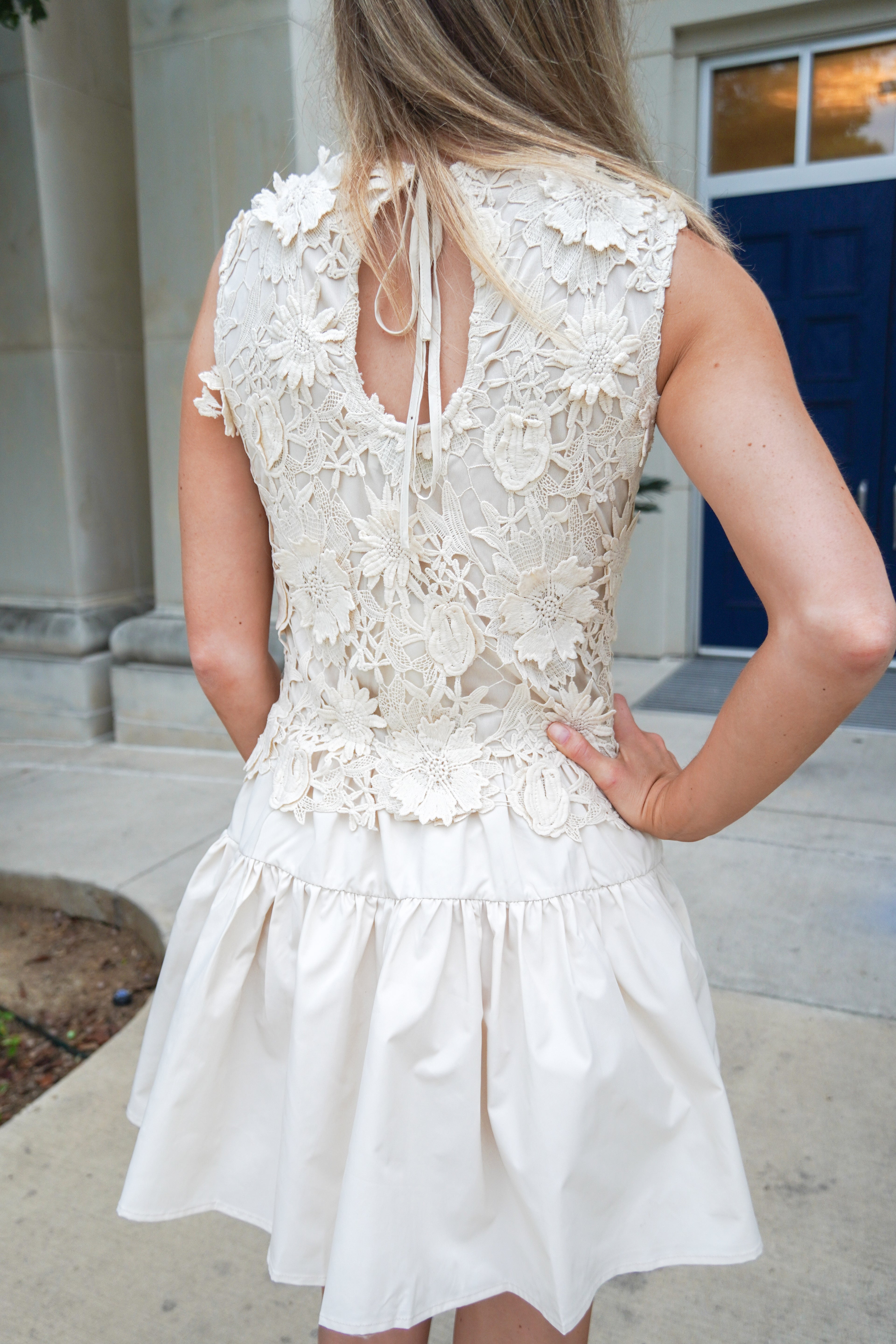 Classic and feminine! Featuring a drop waist and full skirt, and the floral lace overlay adds a touch of elegance! This mini dress will be the talk of your next occasion!!
