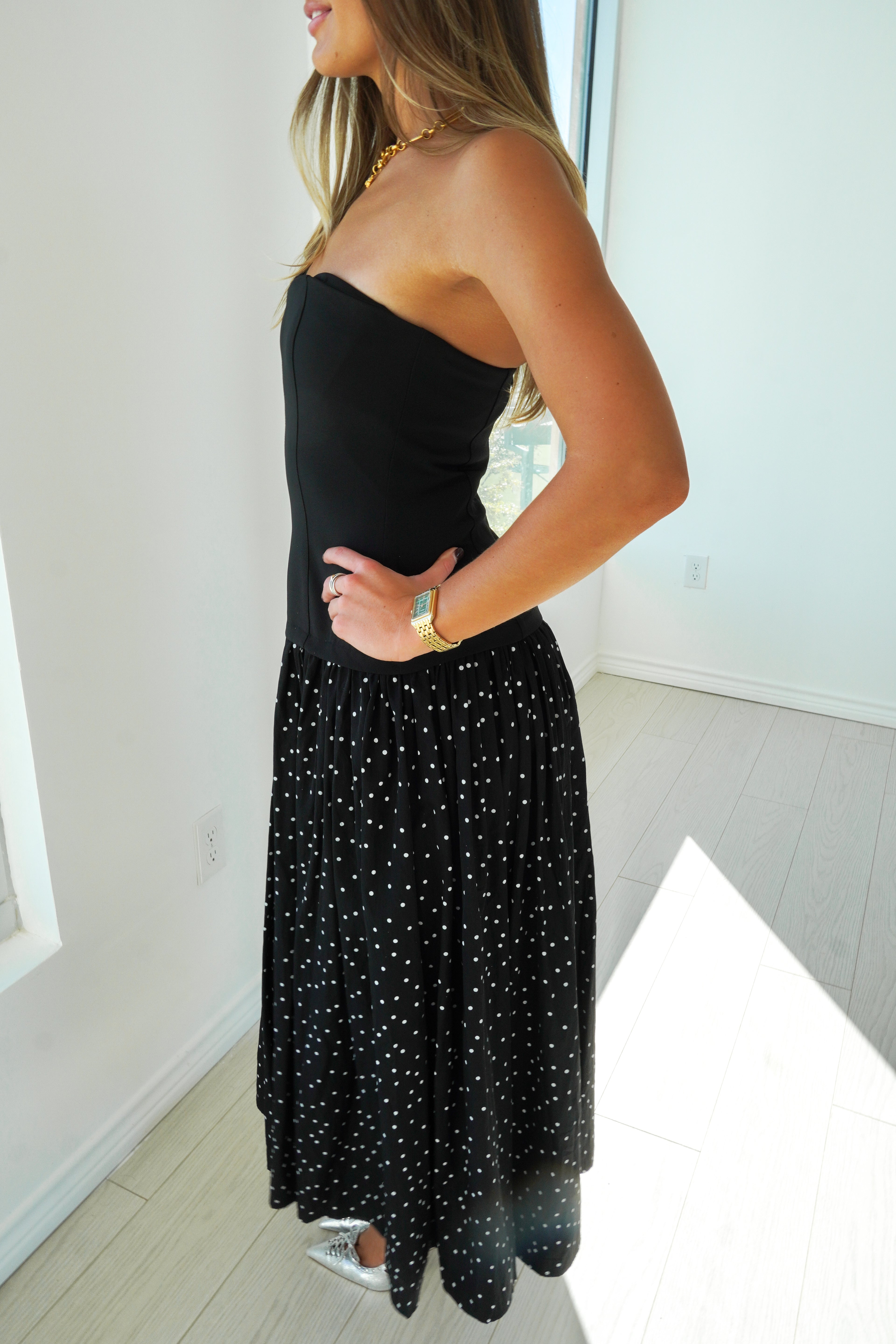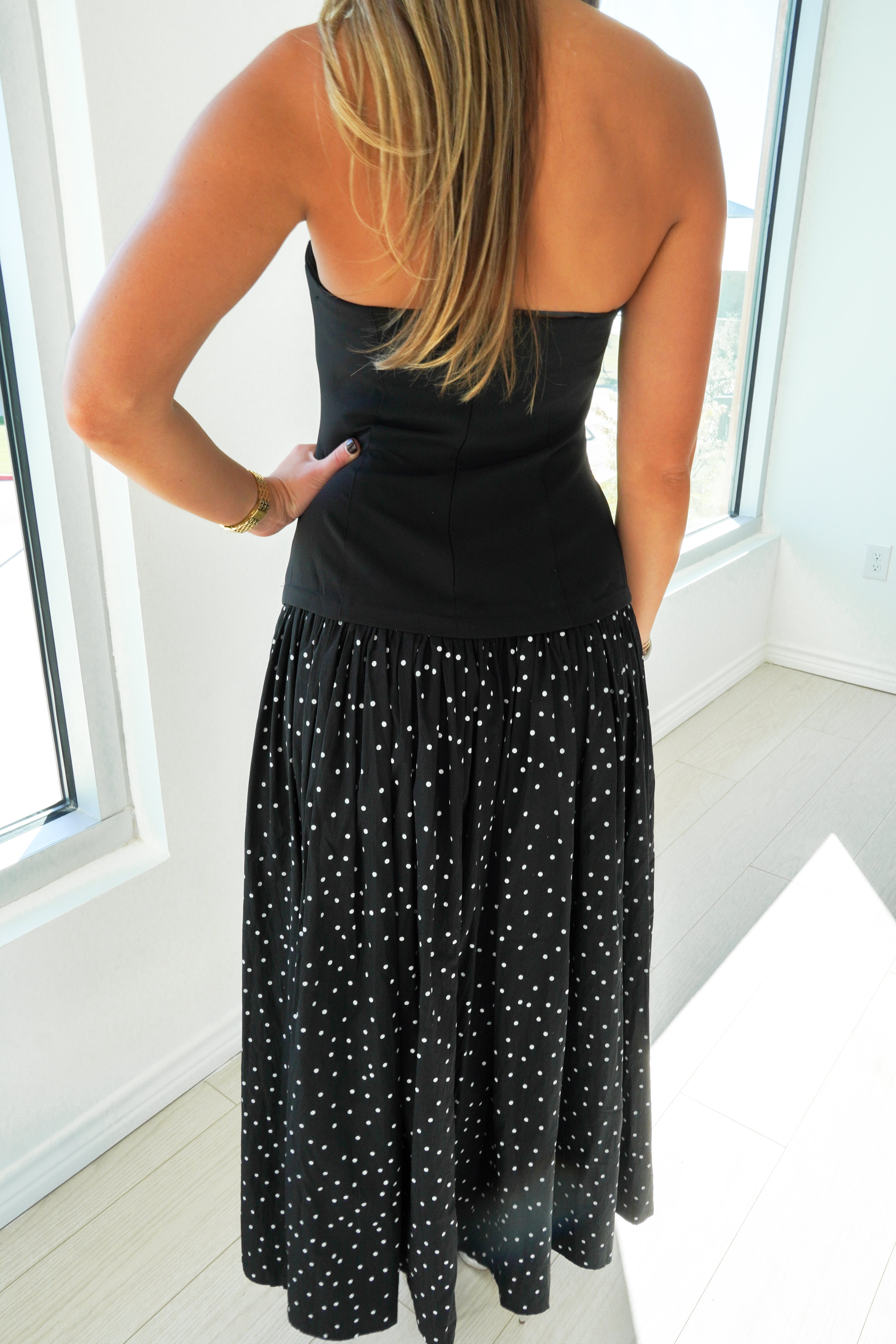Featuring a strapless neckline, a drop waist, and a polka dot full skirt, this maxi dress is so fun for your next event!