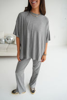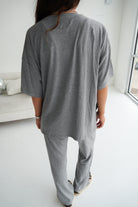 This stylish grey ribbed set includes an oversized t-shirt and matching pants, perfect for a casual yet chic look. The t-shirt features a relaxed, boxy fit with a soft ribbed texture. Paired with the pants, which give an easy, flowing silhouette. The subtle ribbing adds dimension and depth, while the grey color makes it versatile for any occasion. Whether you're lounging at home or out for a quick errand, this outfit delivers both style and comfort in one.