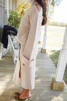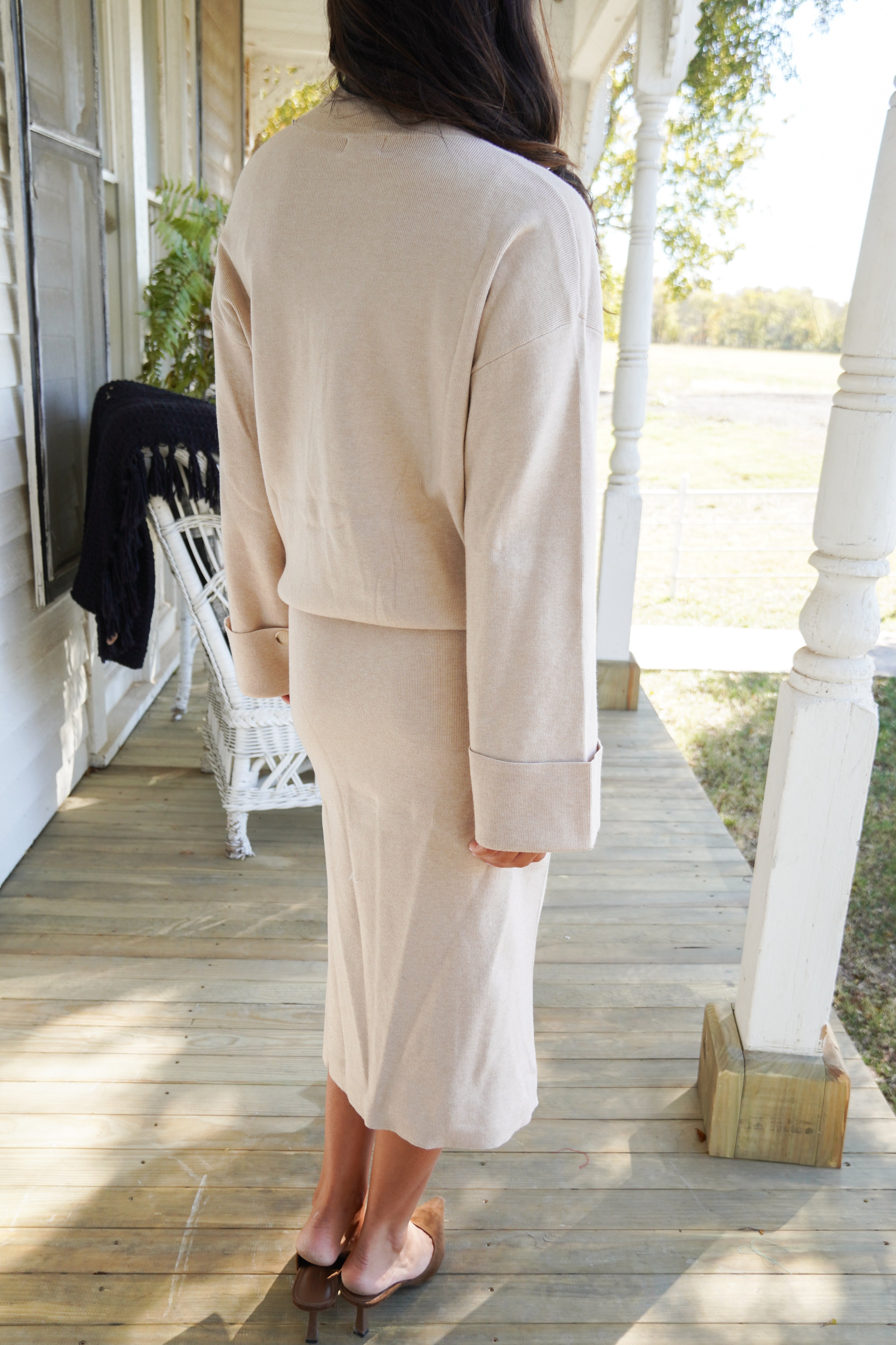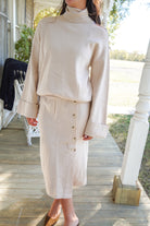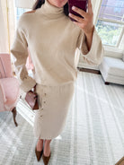 This sweater set has so many fun details! We love the subtle open shoulder on the turtleneck & buttons along the midi skirt. The perfect way to stay warm and look put together!