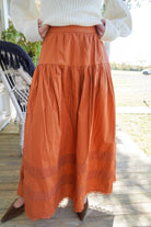 We are loving all the sweet details on this rust maxi skirt! Featuring tiered stitching & a scalloped hem– you are sure to be the best dressed showing up in this!