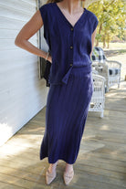 Featuring a cable knit sweater vest and ribbed maxi skirt– this set is perfect for looking chic & staying comfy for all season long! The skirt has the perfect amount of stretch & the top can be unbuttoned giving you different styling options.
