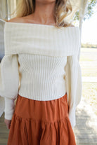 This ivory off the shoulder top is so darling! We love the balloon sleeves & cable knit design. Perfect for dressing up or down this Fall & Winter.