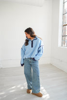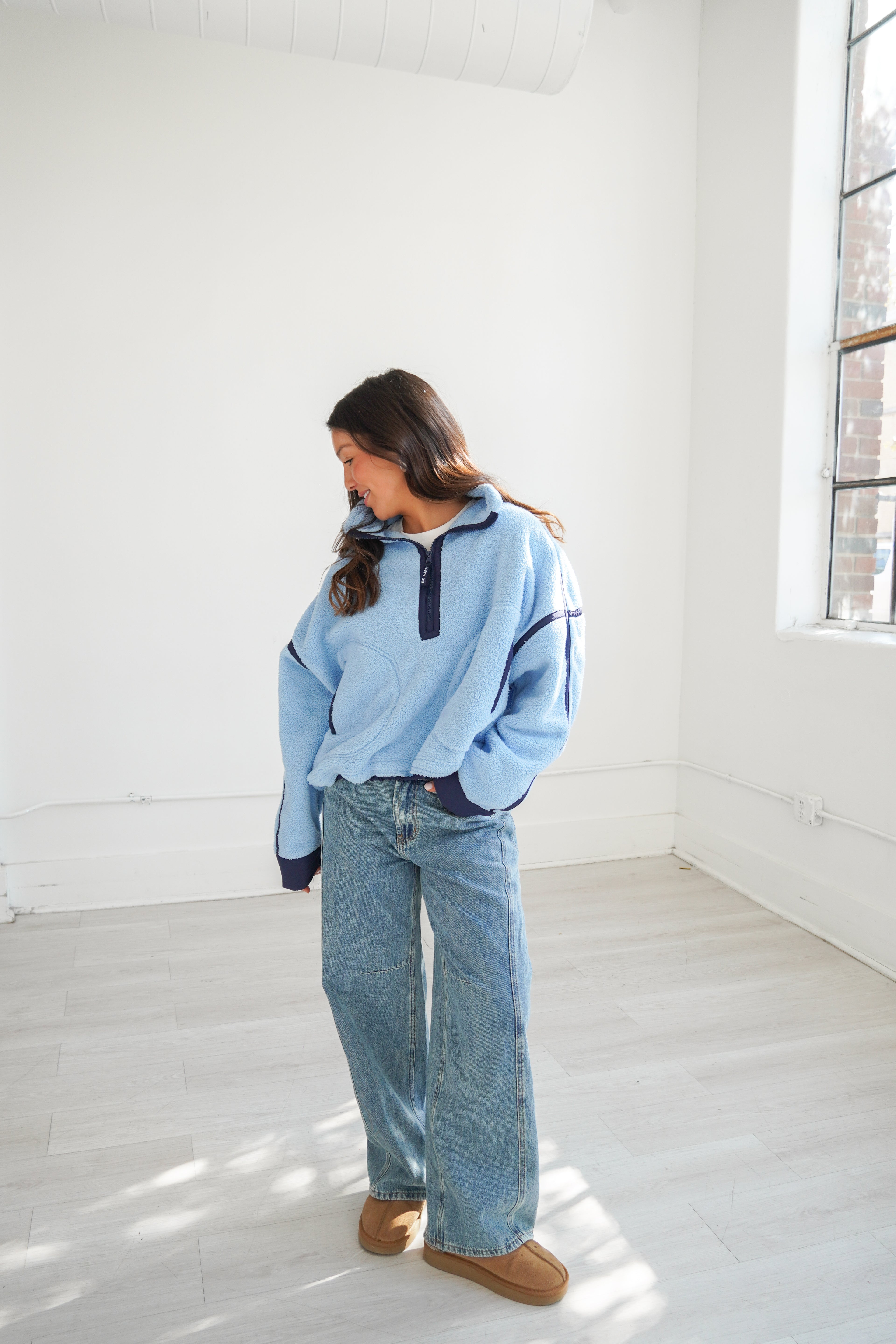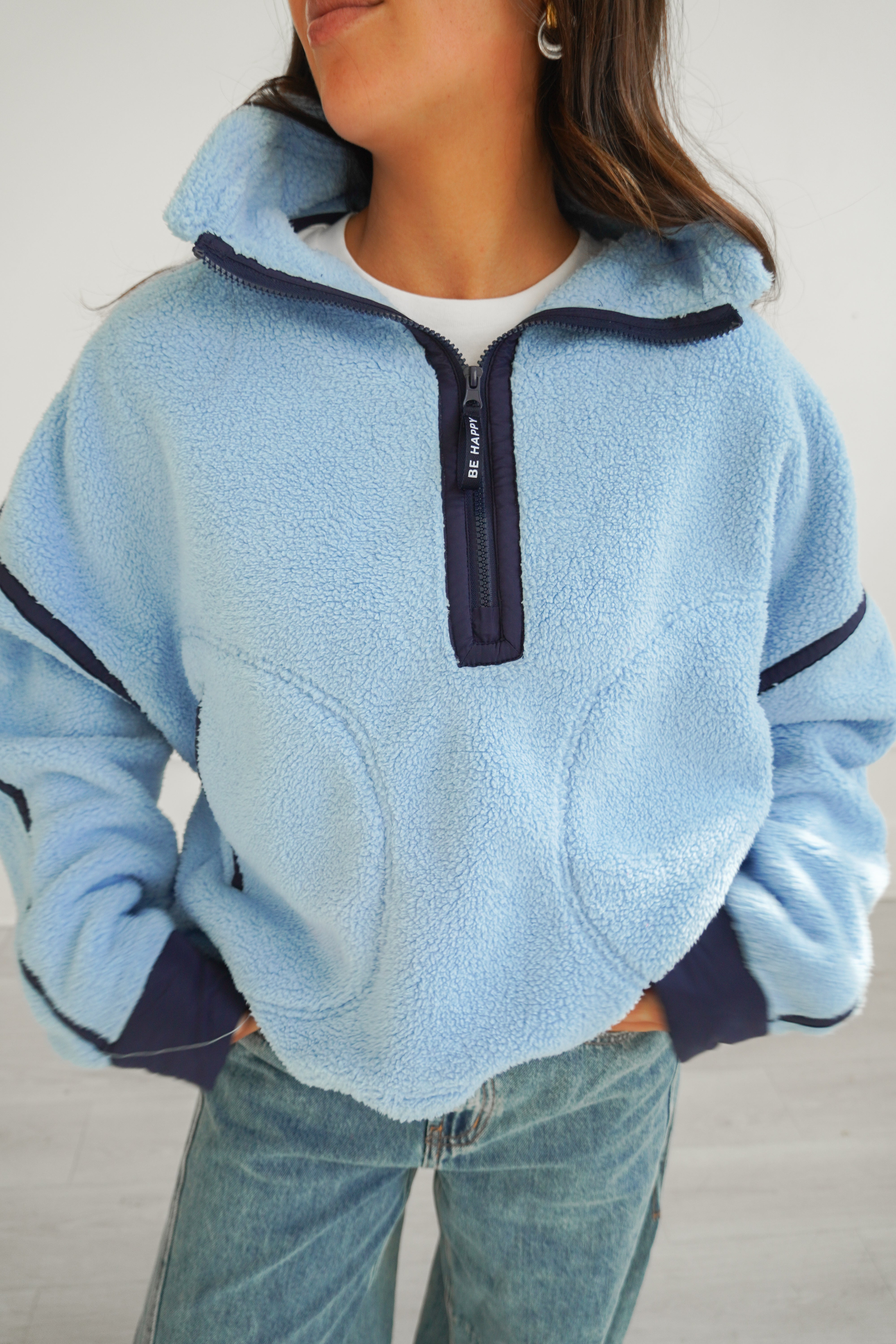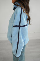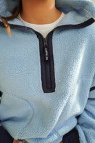 Featuring a two-toned blue fleece jacket with a quarter-zip design making it easy to throw on, while the cinched bottom creates a fun bubble silhouette that adds personality to any outfit.